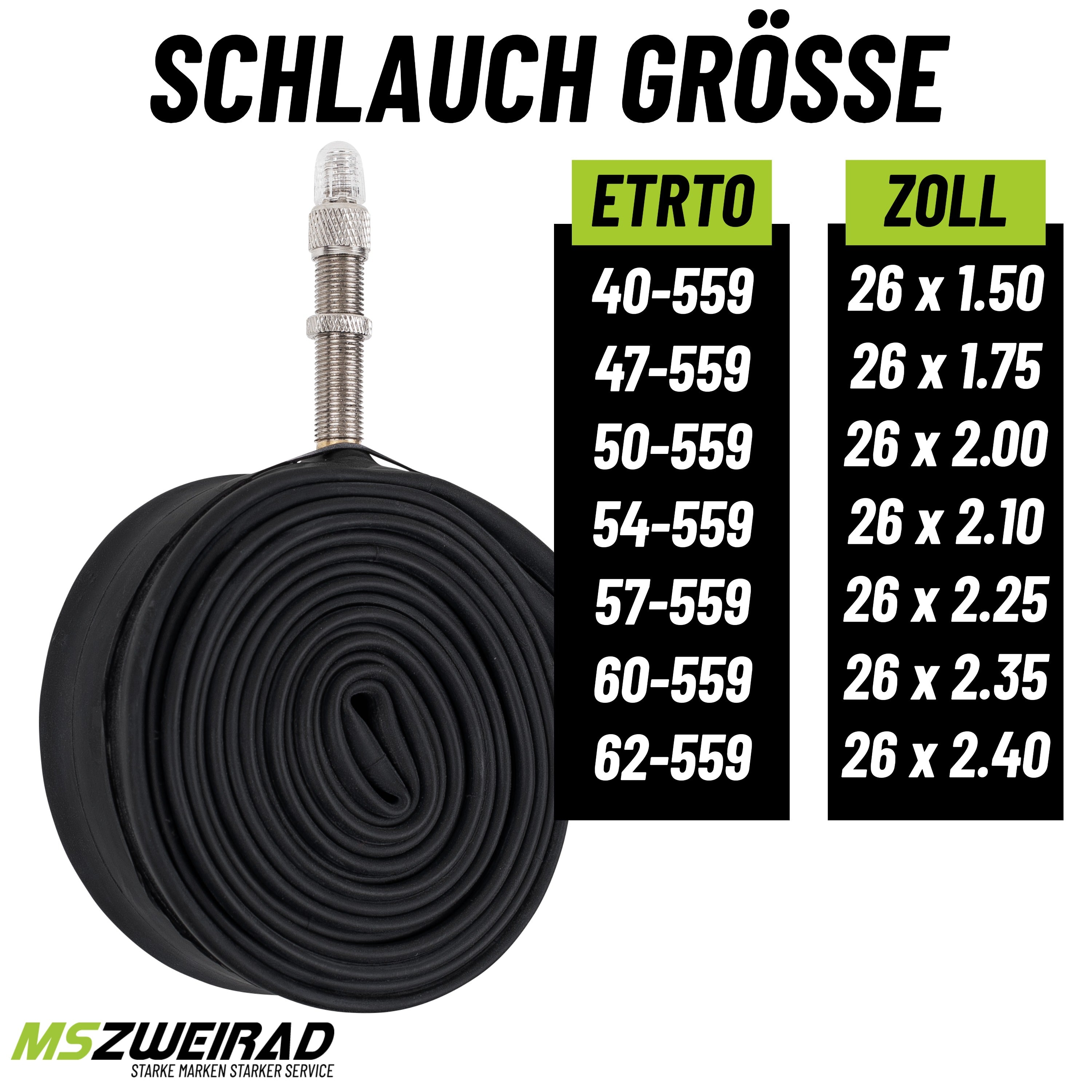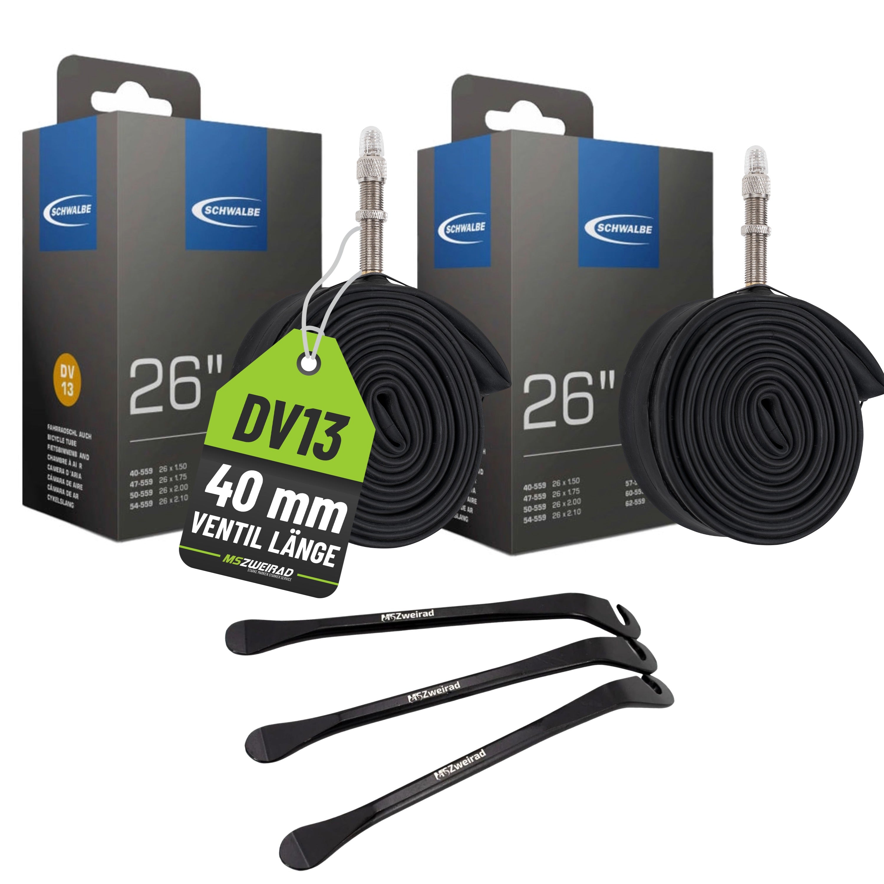 Sie suchen einen Qualitätsschlauch für Ihre 26 Zoll Reifen? Dann ist der Schwalbe Schlauch DV13 genau das Richtige für Sie! Dieses praktische 2er-Set kommt mit 3x stabilen MSZweirad-Reifenhebern für eine einfache Montage. Das ETRTO Maß ist 40/62-559 und das DV Ventil hat eine Länge von 40mm. Mit diesem Satz Schwalbe-Schläuchen sind Sie auf alles vorbereitet und können Ihre rasanten Fahrten ohne Probleme bewältigen.