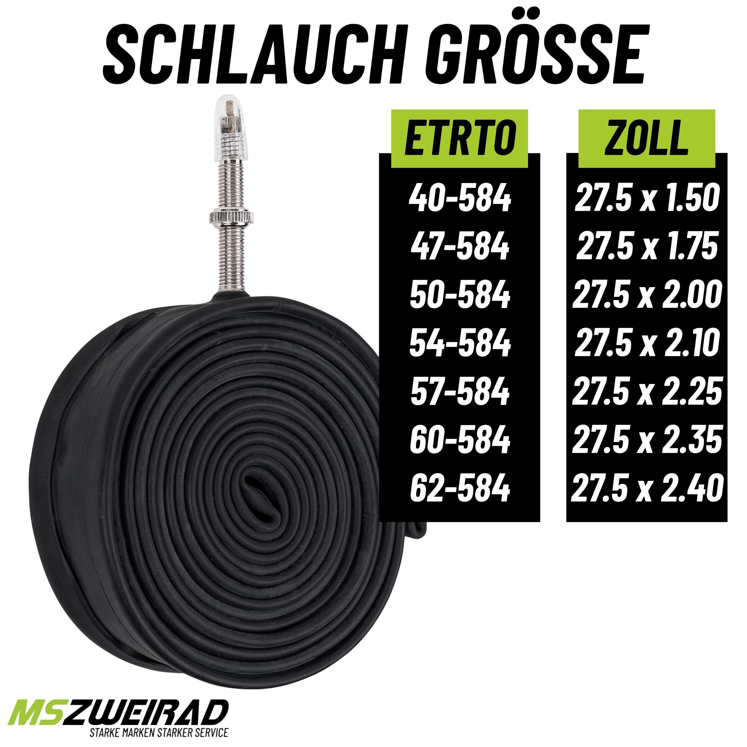 Sie suchen einen Qualitätsschlauch für Ihre 27,5 Zoll Reifen? Dann ist der Schwalbe Schlauch SV21 genau das Richtige für Sie! Dieses praktische 2er-Set kommt mit 3x stabilen MSZweirad-Reifenhebern für eine einfache Montage. Das ETRTO Maß ist 40/62-584 und das SV Ventil hat eine Länge von 40mm.