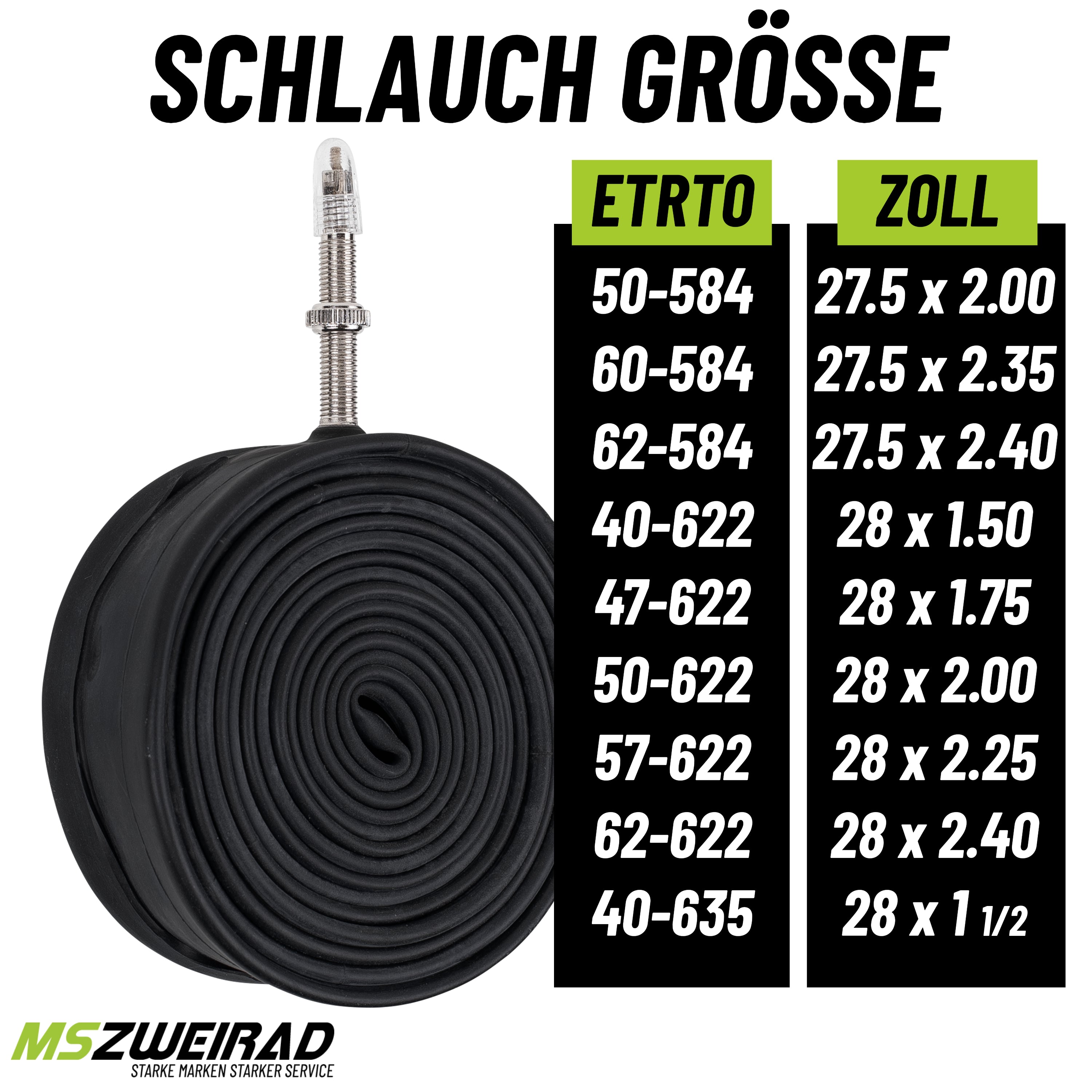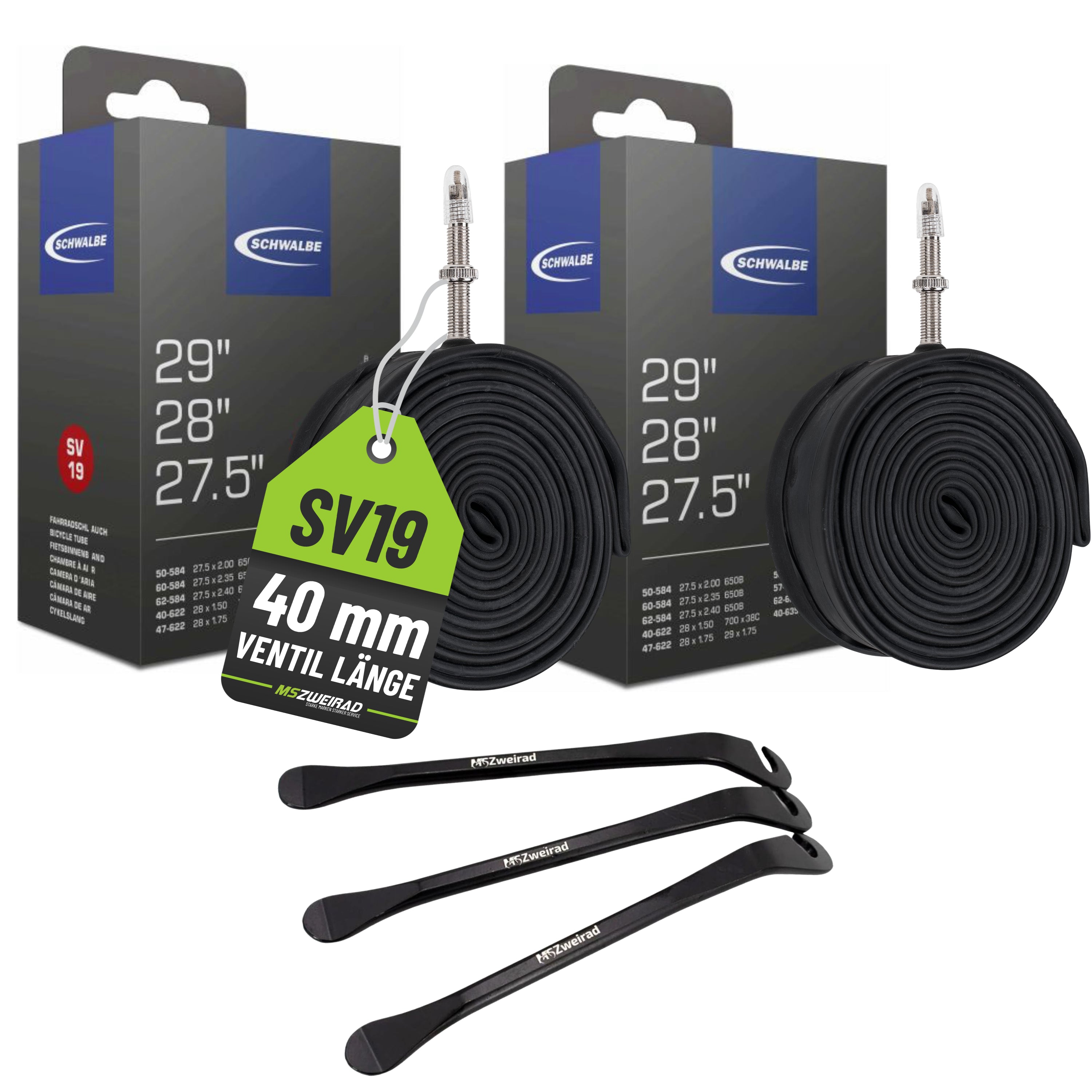 Suchen Sie nach einem zuverlässigen und langlebigen Fahrradschlauch? Hier bieten wir Ihnen die Schwalbe Schläuche an. Dieses Set ist perfekt für diejenigen, die einen Satz von 3 Schläuchen brauchen mit einem ETRTO Maß von 40/62-584/635 und einem SV Ventil in 40mm Länge. Zu dem Schlauchset erhalten Sie zusätzlich unsere stabilen MSZweirad Reifenheber für eine einfache Demontage der alten Räder.