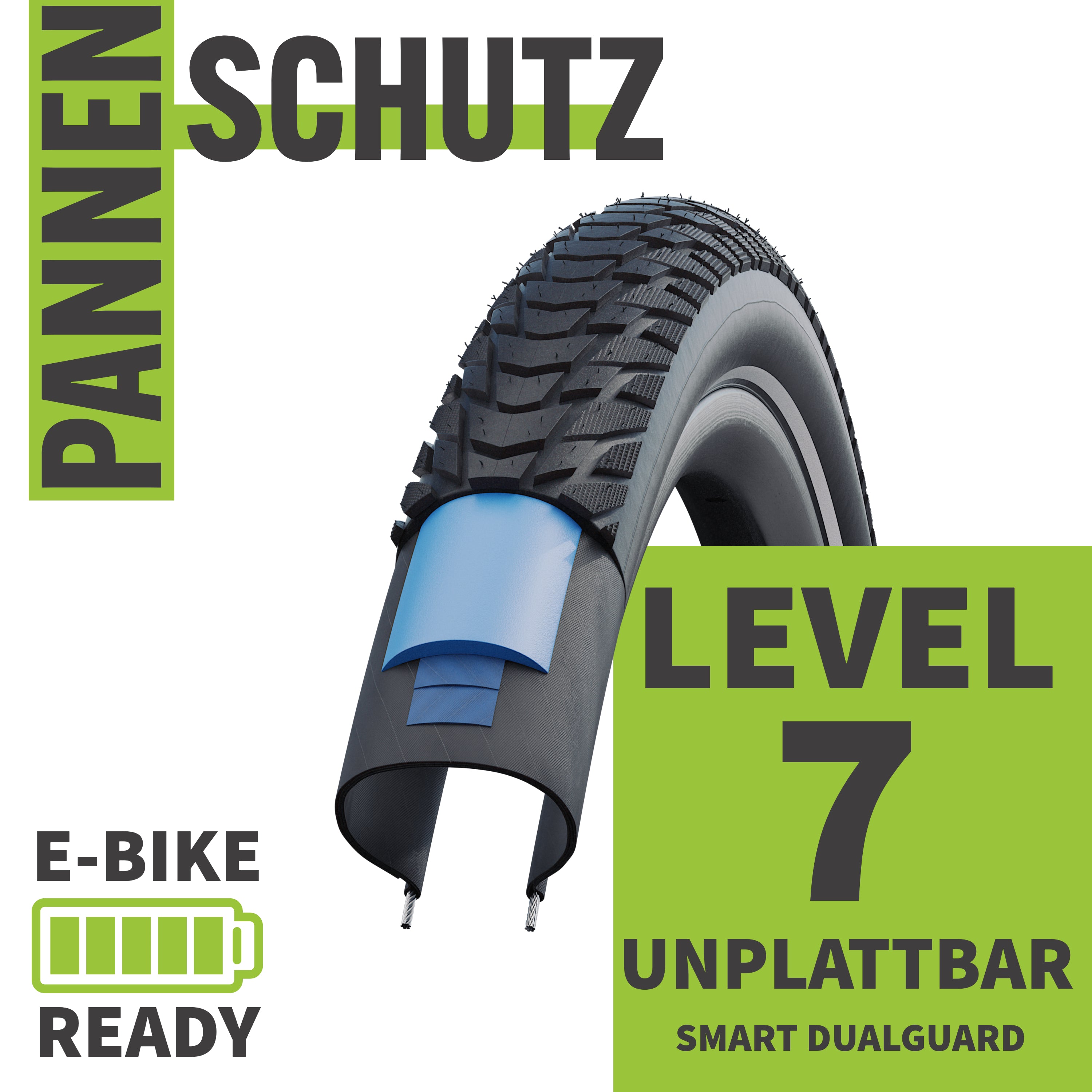 Sicherheit im Straßenverkehr ist entscheidend. Die integrierten Reflexstreifen der Schwalbe Marathon E-Plus Reifen sorgen für optimale Sichtbarkeit, selbst bei schlechten Lichtverhältnissen. Diese reflektierenden Elemente erhöhen Ihre Sichtbarkeit für andere Verkehrsteilnehmer und tragen somit zu Ihrer Sicherheit bei – ideal für die Stadt oder lange Touren.