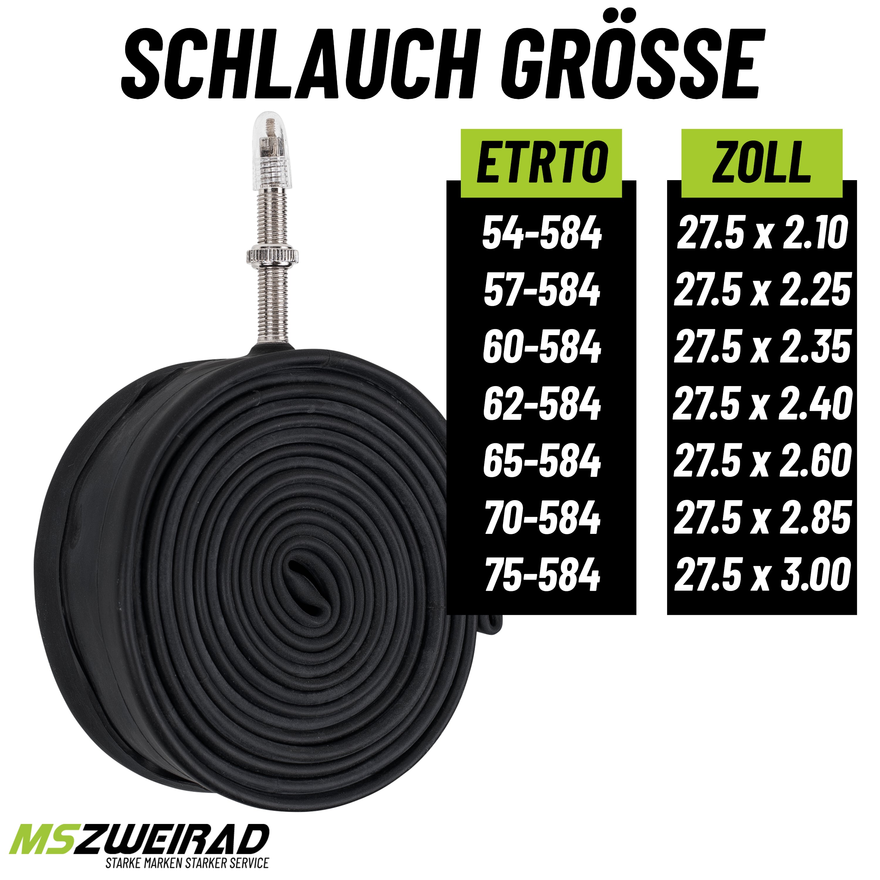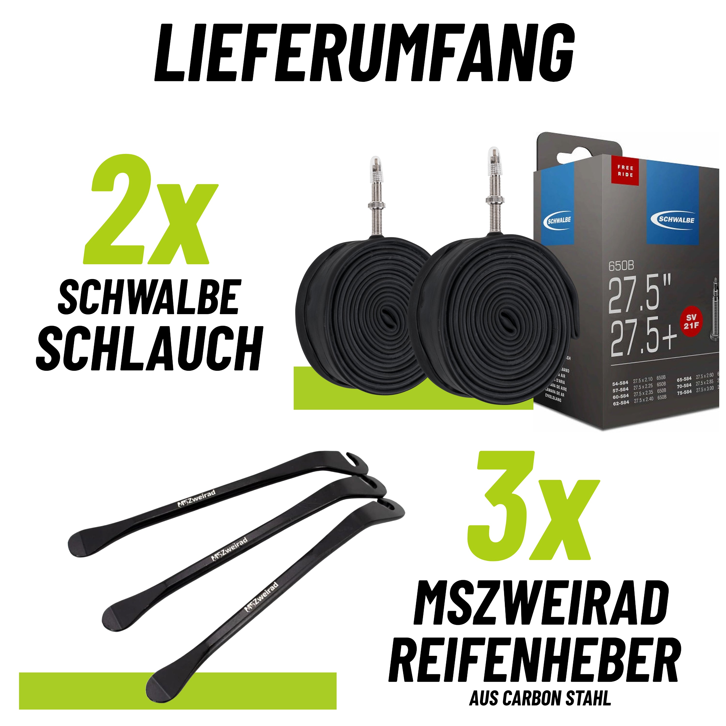 Sie suchen einen Qualitätsschlauch für Ihre 27,5 Zoll Freeride-Reifen? Dann ist der Schwalbe Schlauch 21F genau das Richtige für Sie! Dieses praktische 2er-Set ist perfekt für extra breite Reifen und kommt mit 3x stabilen MSZweirad-Reifenhebern für eine einfache Montage. Das ETRTO Maß ist 54/75-584 und das SV Ventil hat eine Länge von 40mm. Mit diesem Satz Schwalbe-Schläuchen sind Sie auf alles vorbereitet und können Ihre rasanten Fahrten ohne Probleme bewältigen.