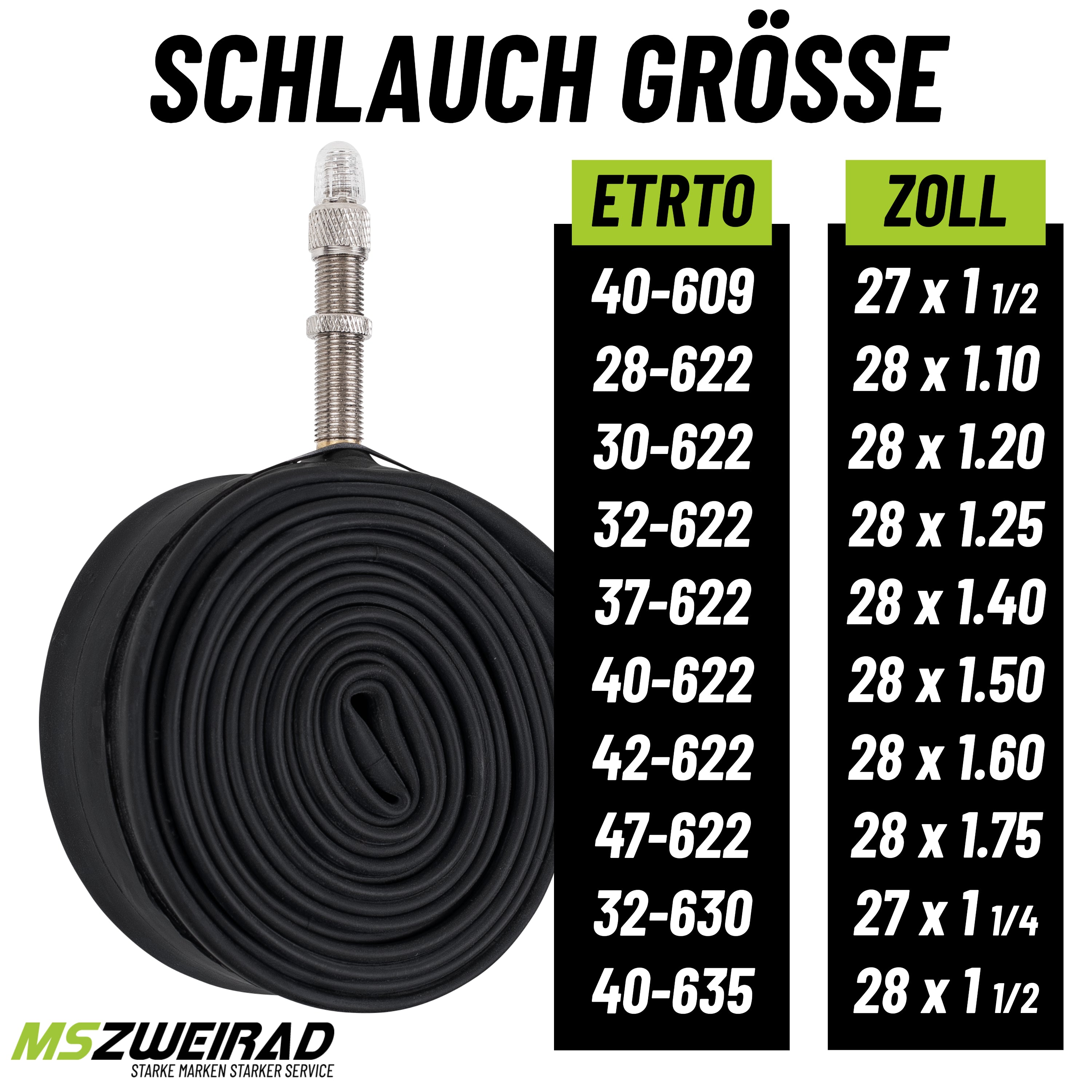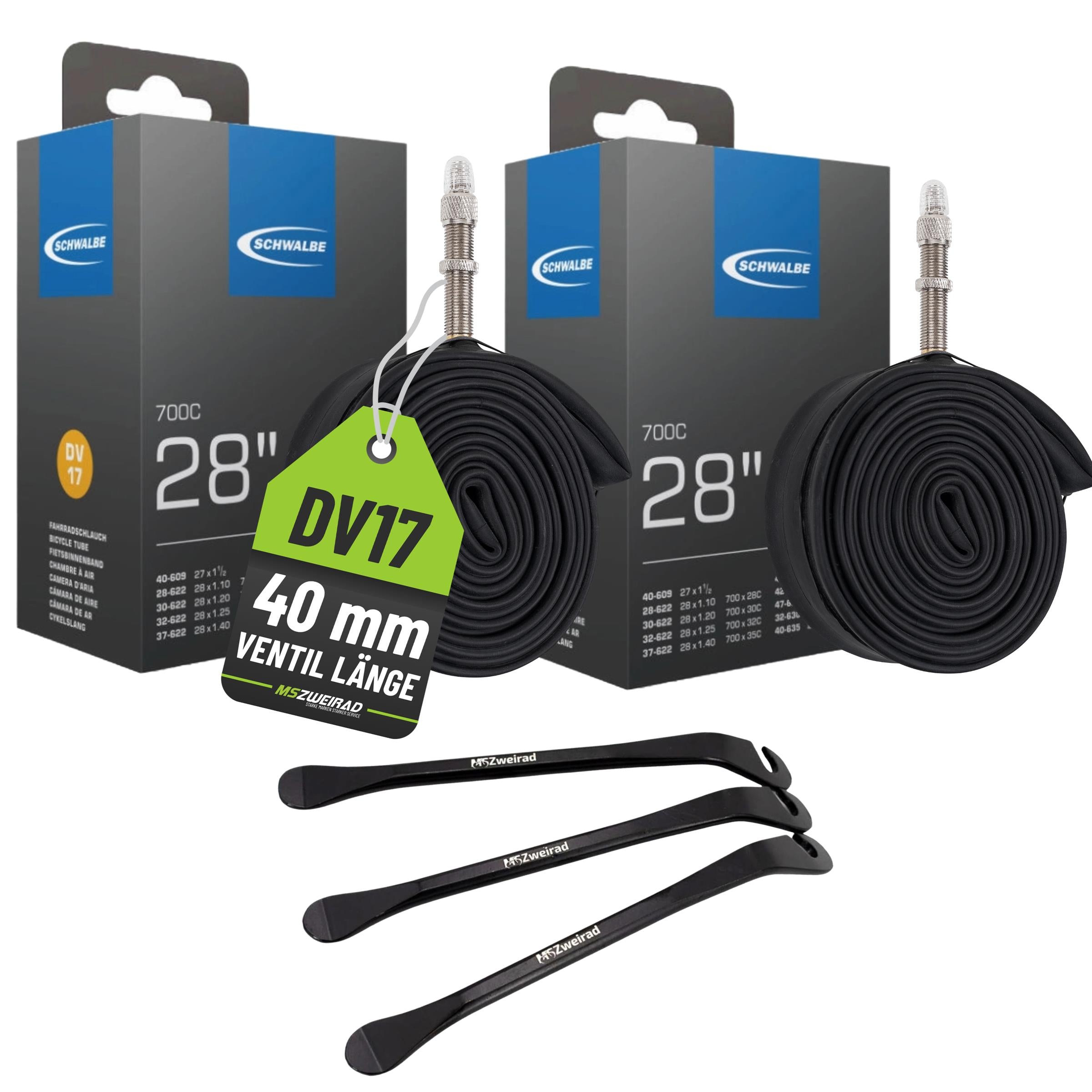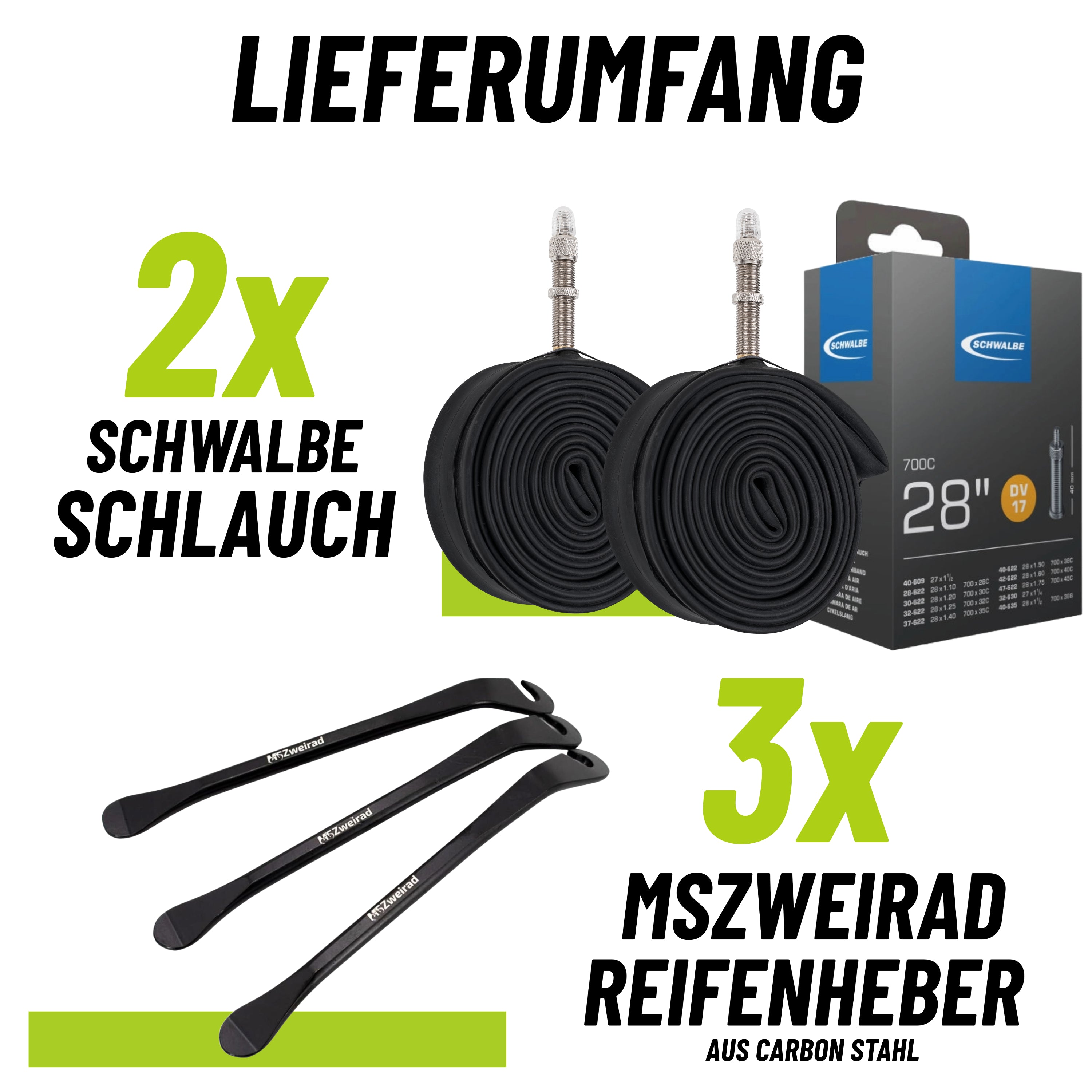 Suchen Sie nach einem zuverlässigen und langlebigen Fahrradschlauch? Hier bieten wir Ihnen die Schwalbe Schläuche an. Dieses Set ist perfekt für diejenigen, die einen Satz von 2 Schläuchen brauchen mit einem ETRTO Maß von 28/47-622/635 und einem DV Ventil in 40mm Länge. Zu dem Schlauchset erhalten Sie zusätzlich unsere stabilen MSZweirad Reifenheber für eine einfache Demontage der alten Räder.