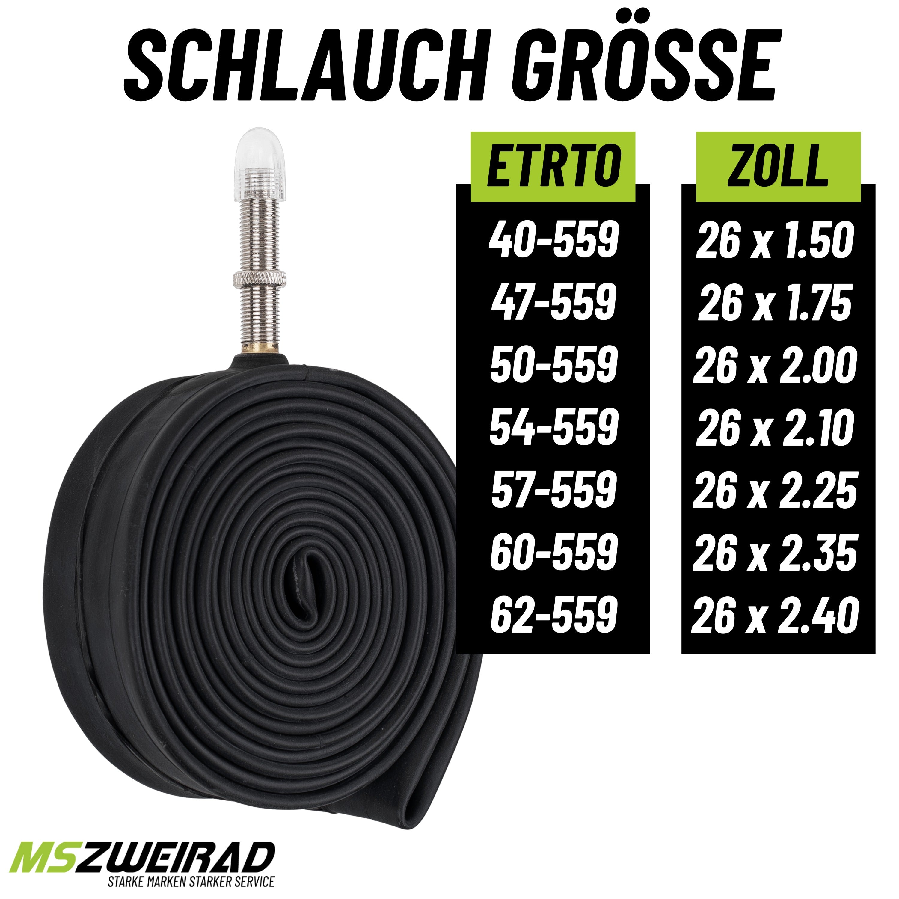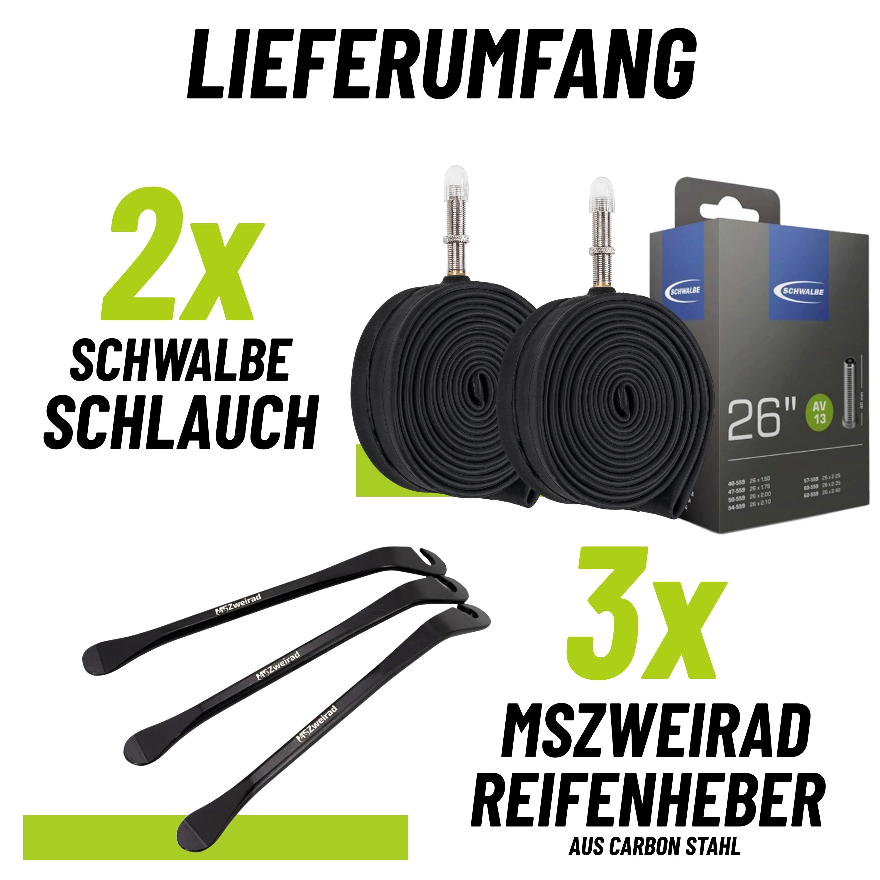 Suchen Sie nach einem zuverlässigen und langlebigen Fahrradschlauch? Hier bieten wir Ihnen die Schwalbe Schläuche an. Dieses Set ist perfekt für diejenigen, die einen Satz von 2 Schläuchen brauchen mit einem ETRTO Maß von 40/62-559 und einem AV Ventil in 40mm Länge. Zu dem Schlauchset erhalten Sie zusätzlich unsere stabilen MSZweirad Reifenheber für eine einfache Demontage der alten Räder.