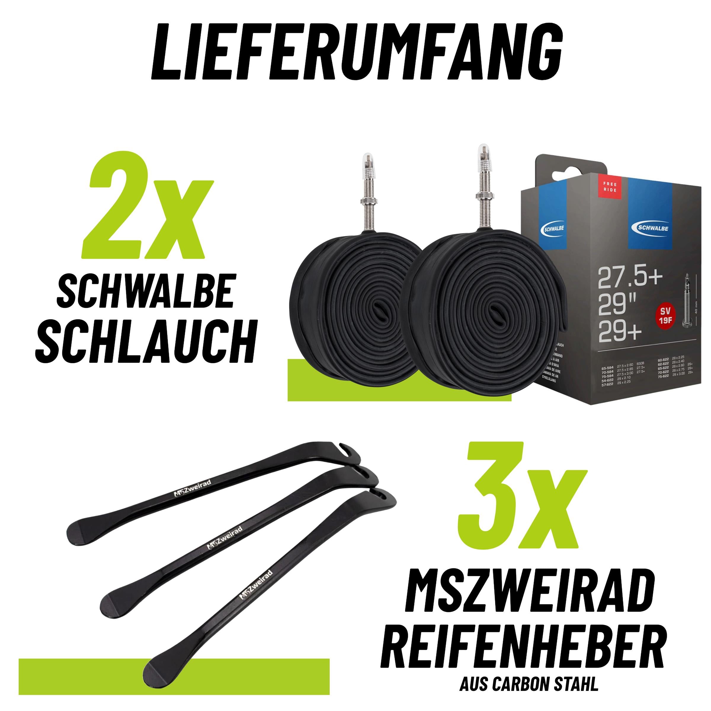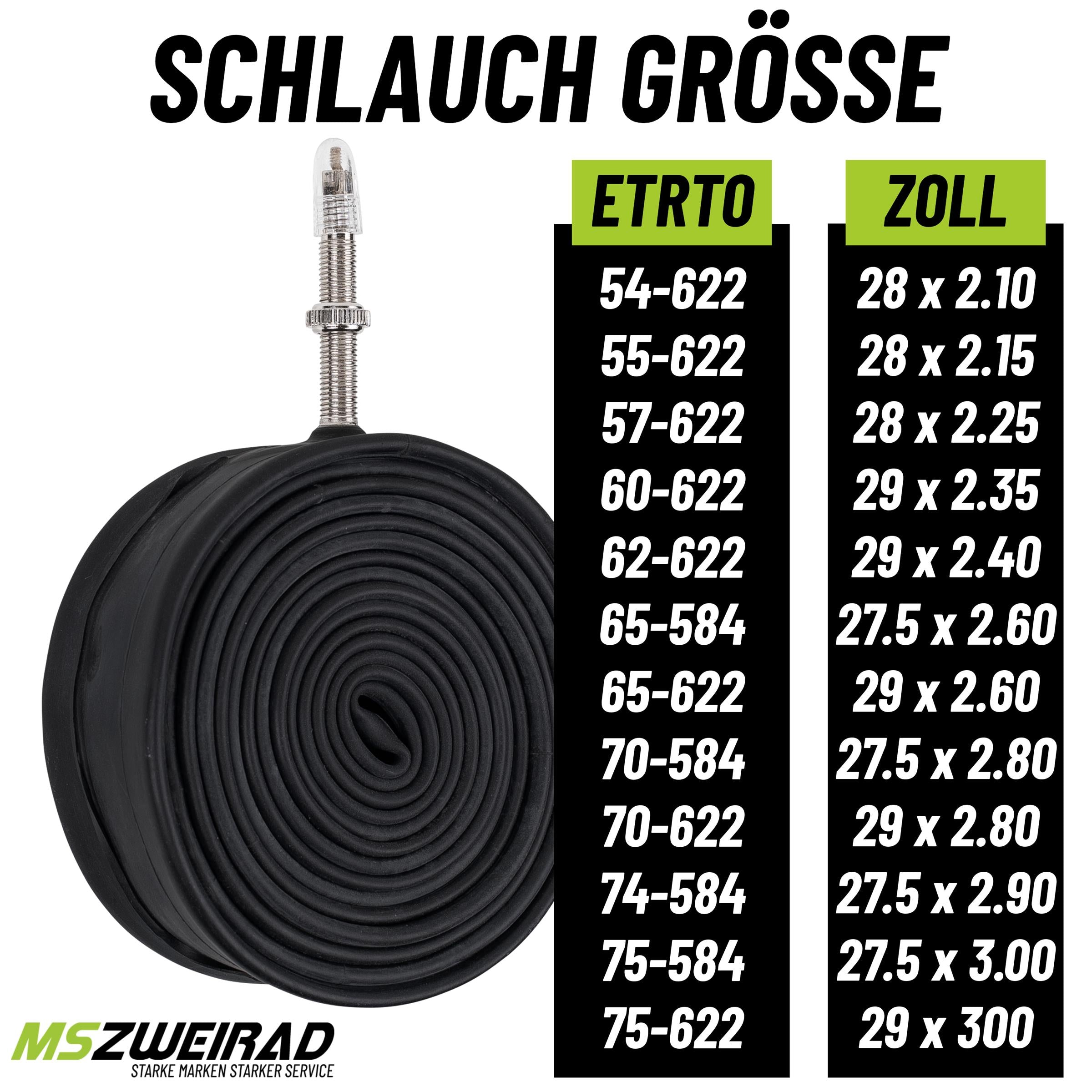 Sie suchen einen Qualitätsschlauch für Ihre 28 und 29 Zoll Freeride-Reifen? Dann ist der Schwalbe Schlauch SV19F genau das Richtige für Sie! Dieses praktische 2er-Set ist perfekt für extra breite Reifen und kommt mit 3x stabilen MSZweirad-Reifenhebern für eine einfache Montage. Das ETRTO Maß ist 54/75-622 und das SV Ventil hat eine Länge von 40mm. Mit diesem Satz Schwalbe-Schläuchen sind Sie auf alles vorbereitet und können Ihre rasanten Fahrten ohne Probleme bewältigen.