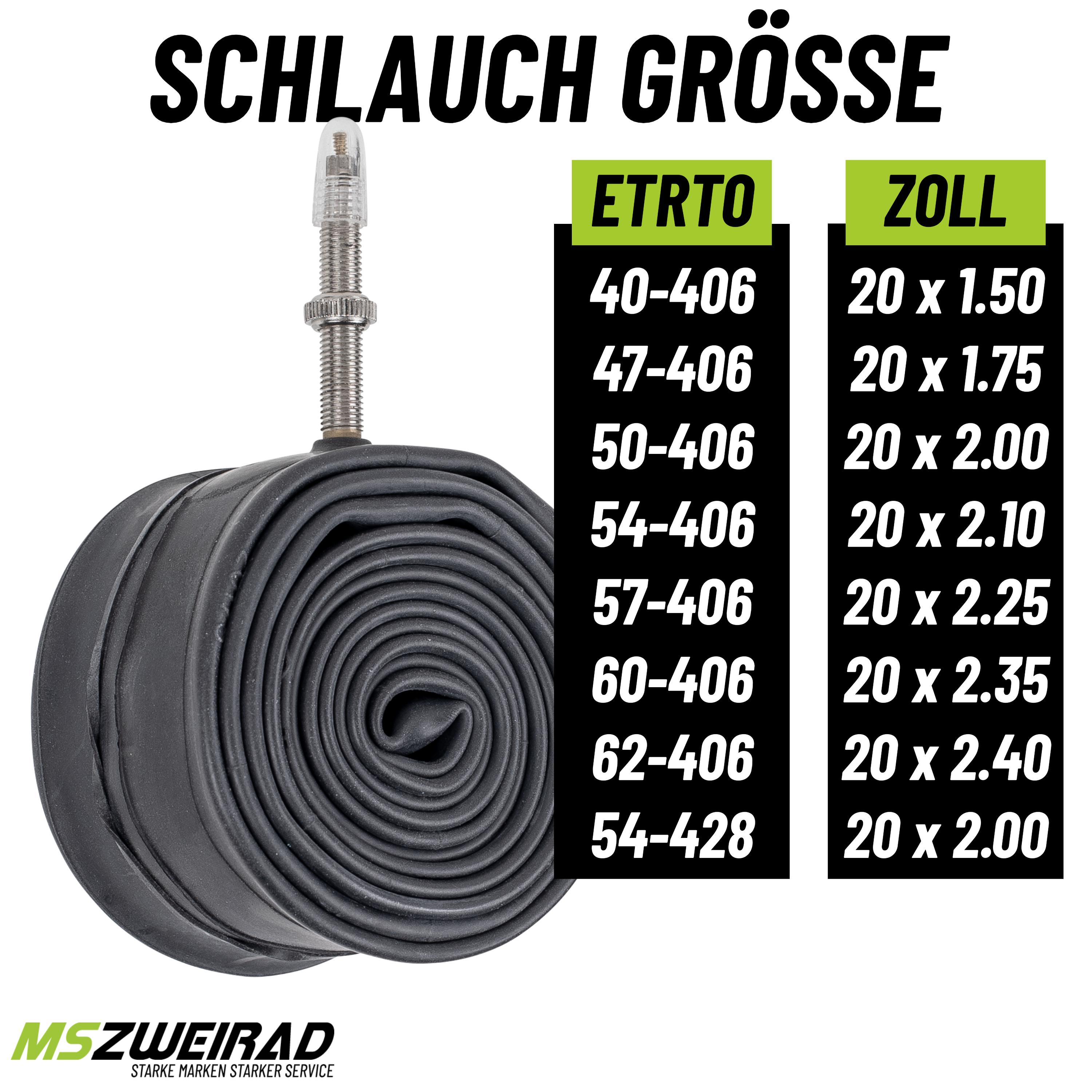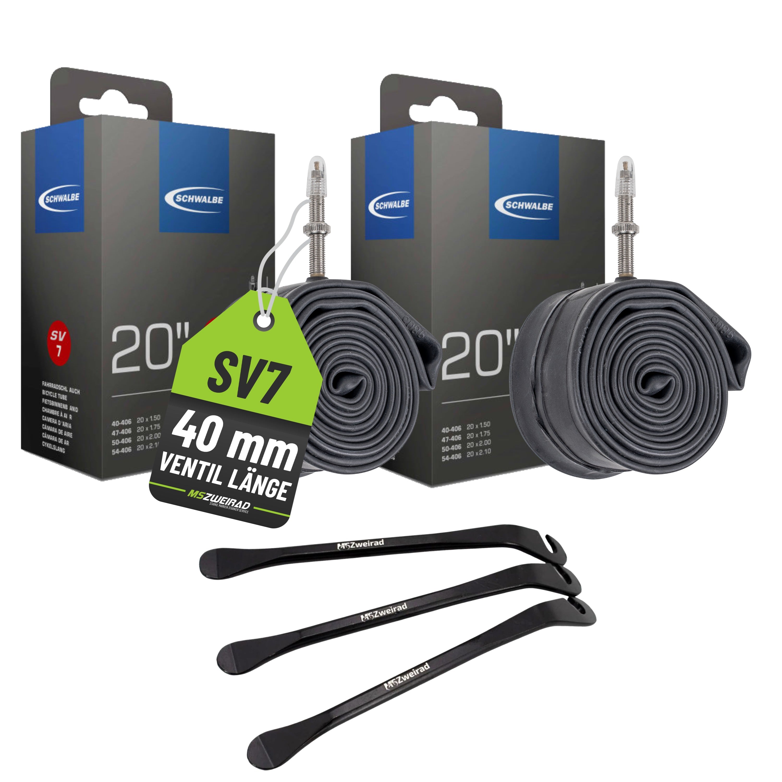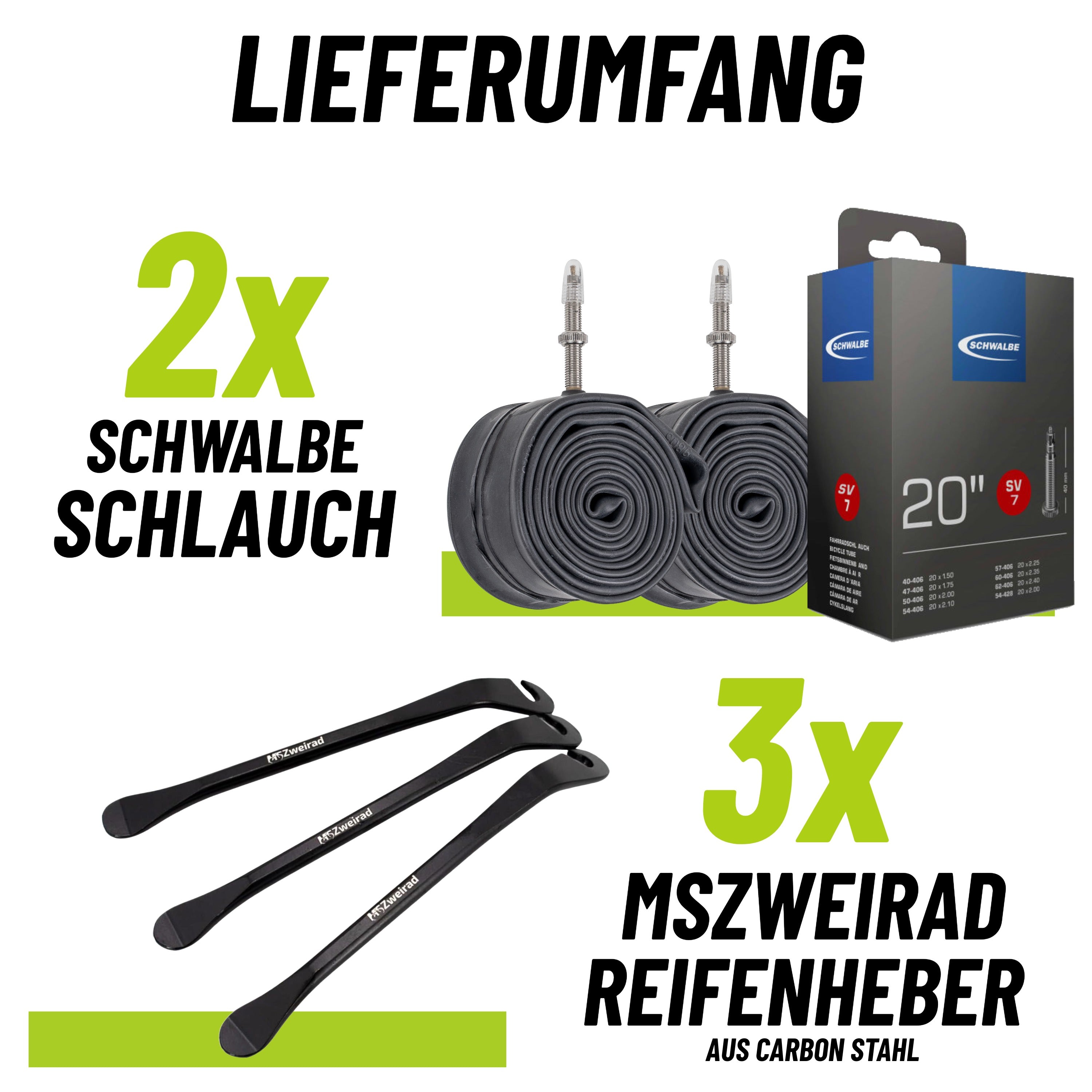 Suchen Sie nach einem zuverlässigen und langlebigen Fahrradschlauch? Hier bieten wir Ihnen die Schwalbe Schläuche an. Dieses Set ist perfekt für diejenigen, die einen Satz von 2 Schläuchen brauchen mit einem ETRTO Maß von 40/62-406 und einem SV Ventil in 40mm Länge. Passend für die Maße: 40-406, 42-406, 44-406, 47-406, 50-406, 54-406, 55-406, 57-406, 60-406. Zu dem Schlauchset erhalten Sie zusätzlich unsere stabilen MSZweirad Reifenheber aus Metall für eine einfache Demontage der alten Räder.
