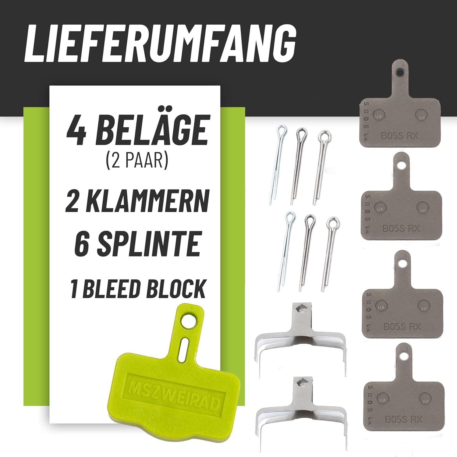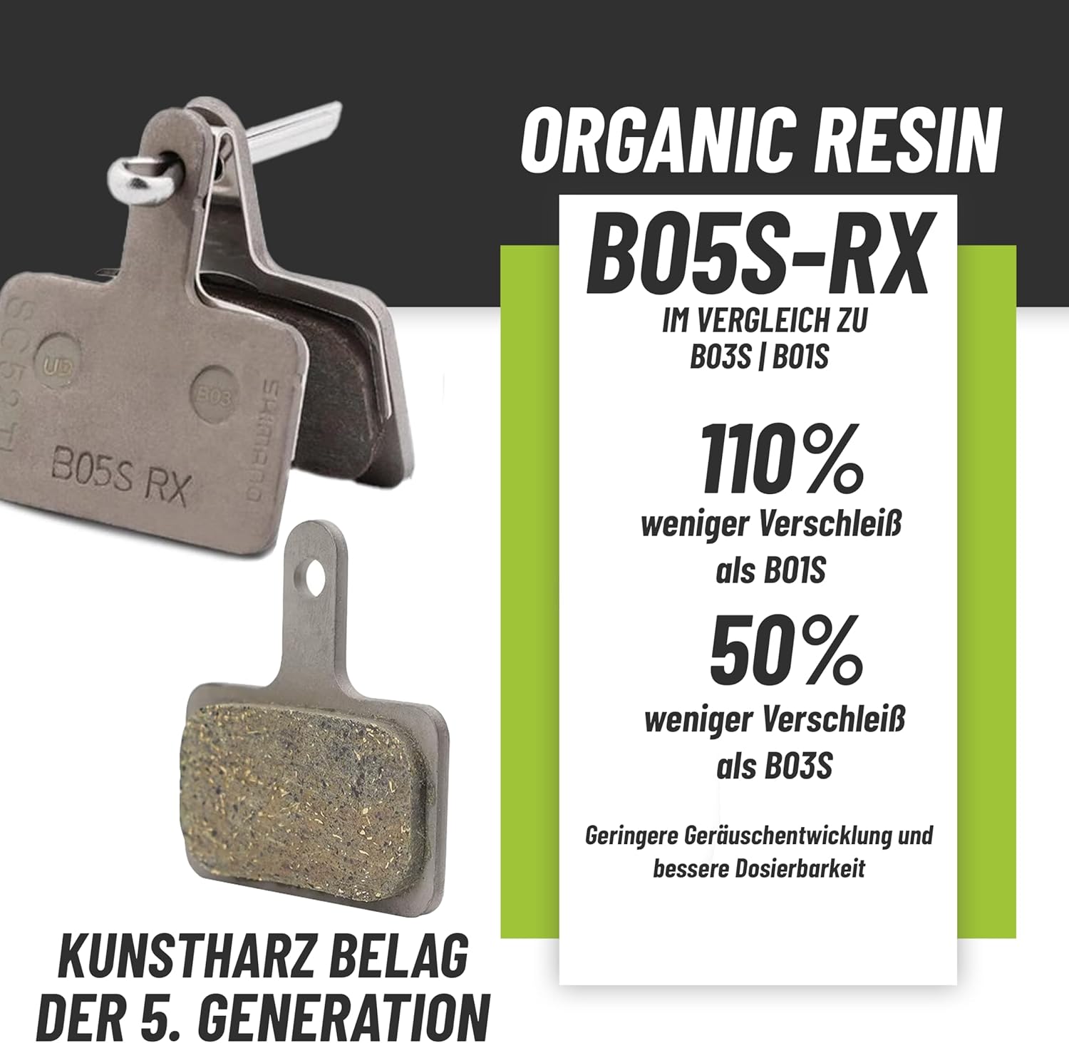 Wir stellen Ihnen die Shimano B05S-RX-Bremsbeläge vor! Diese Beläge bestehen aus organischem Harz und sind daher leiser als Metallbeläge. Außerdem haben sie eine 50%ige bessere Verschleißfestigkeit gegenüber dem vorherigen Modell B03S. Der Satz von 2 Belägen werden lose in einer Werkstattverpackung geliefert. Zusätzlich zu dem Set erhalten Sie ein MSZweirad Bleeding Block.
