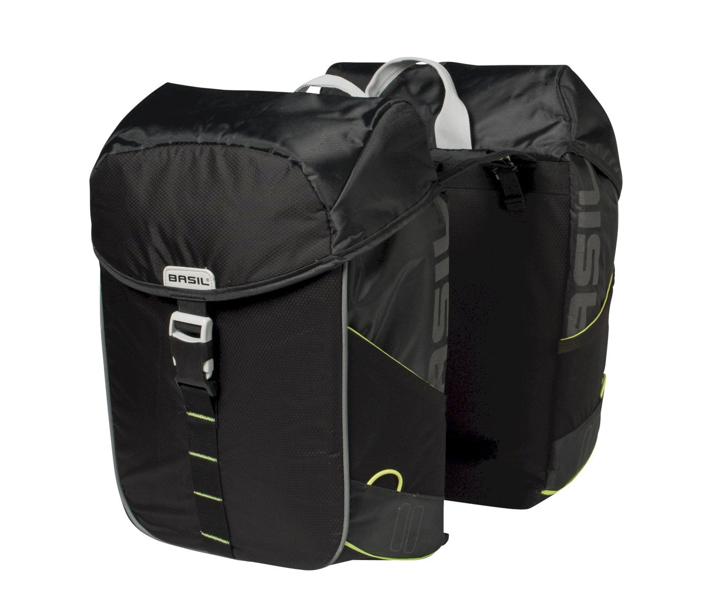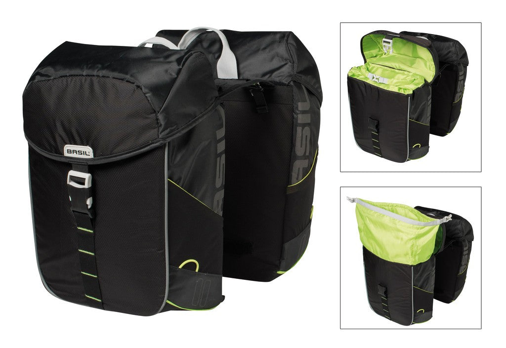Die Basil Doppeltasche Miles Schwarz ist eine vielseitige Fahrradtasche für Pendler und Radreisende. Sie besteht aus wasserdichtem Polyester und hat einen Rollverschluss für sichere Aufbewahrung bei jedem Wetter. Die Tasche bietet 34 Liter Volumen und hat eine Reflexion für bessere Sichtbarkeit. Sie wird mit dem Universal Bridge System auf gängigen Gepäckträgern befestigt und ist kompatibel mit dem MIK System. Mit ihren Maßen von 34 x 16 x 43 cm ist sie geräumig und praktisch für unterwegs.