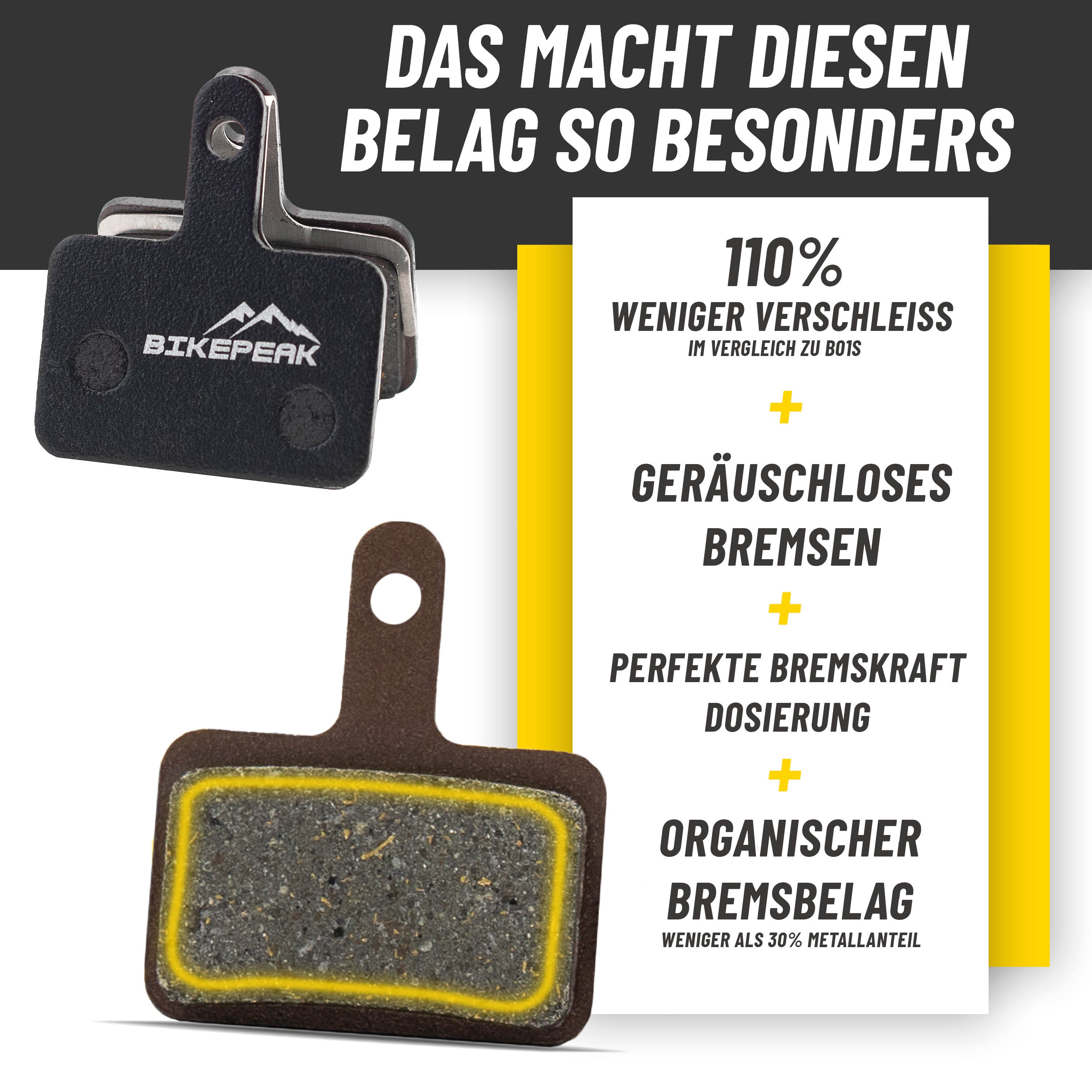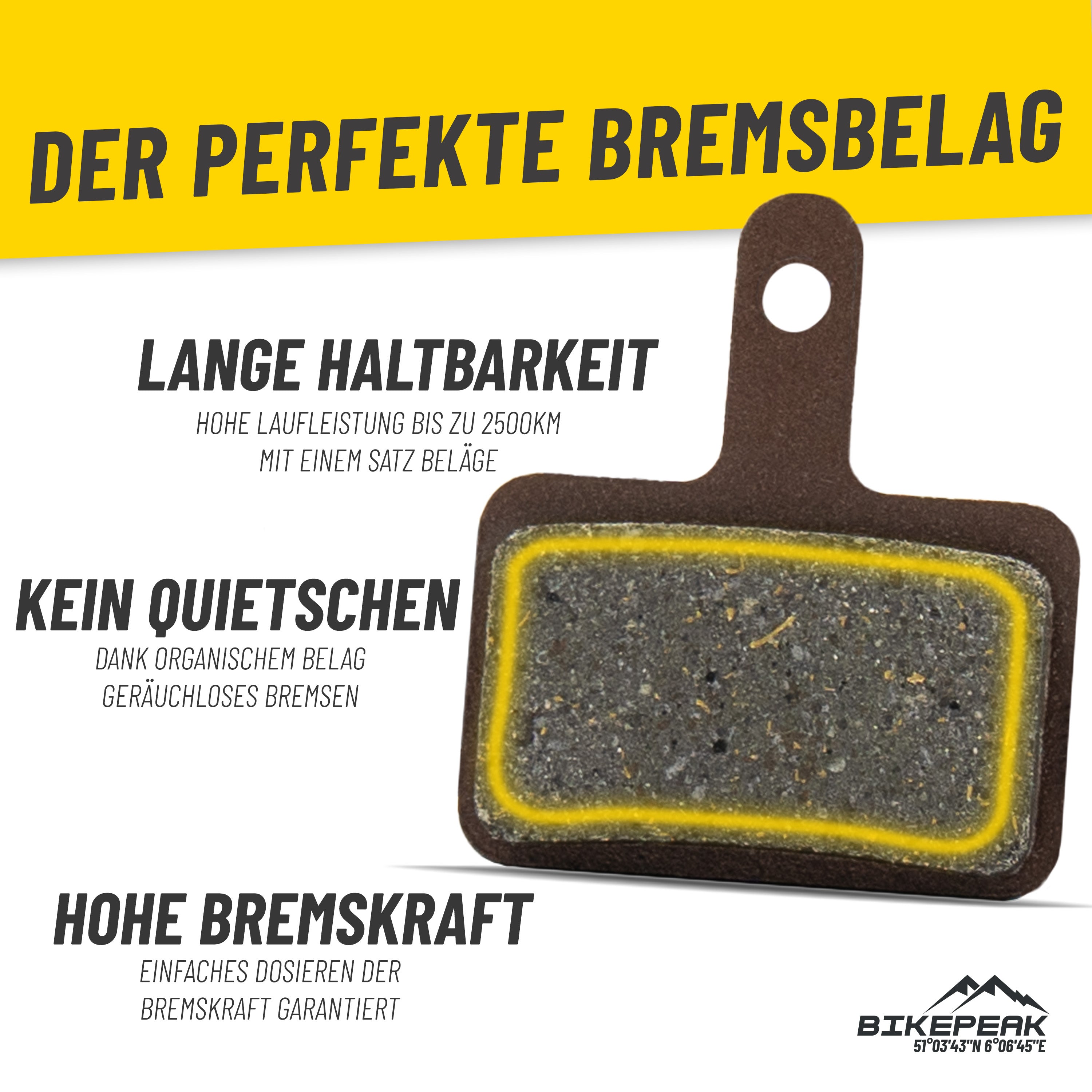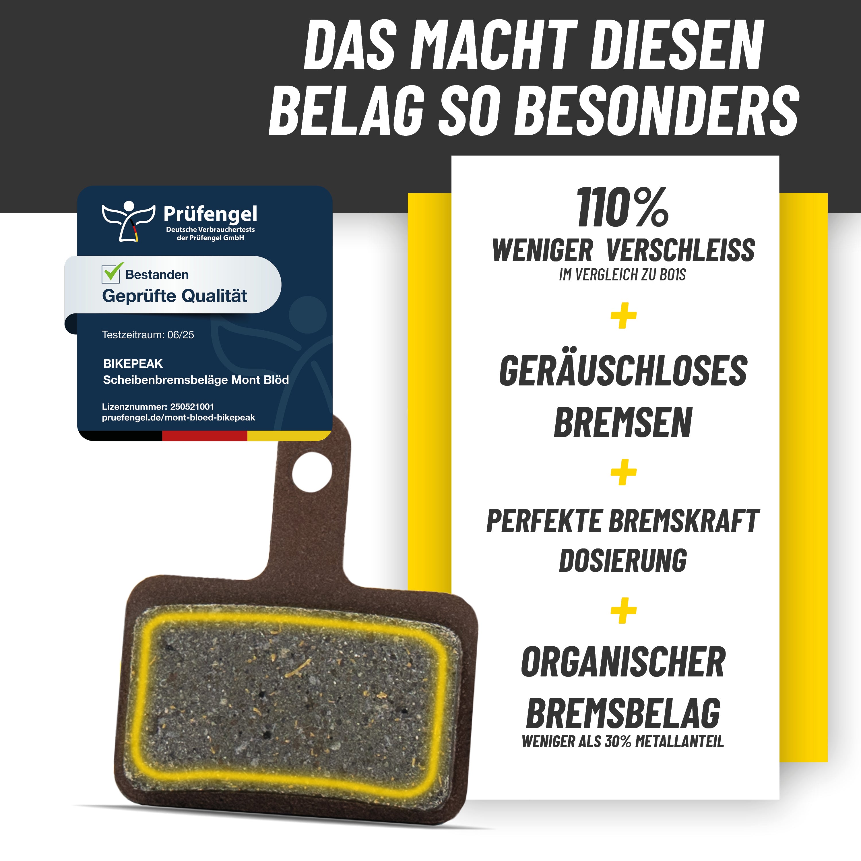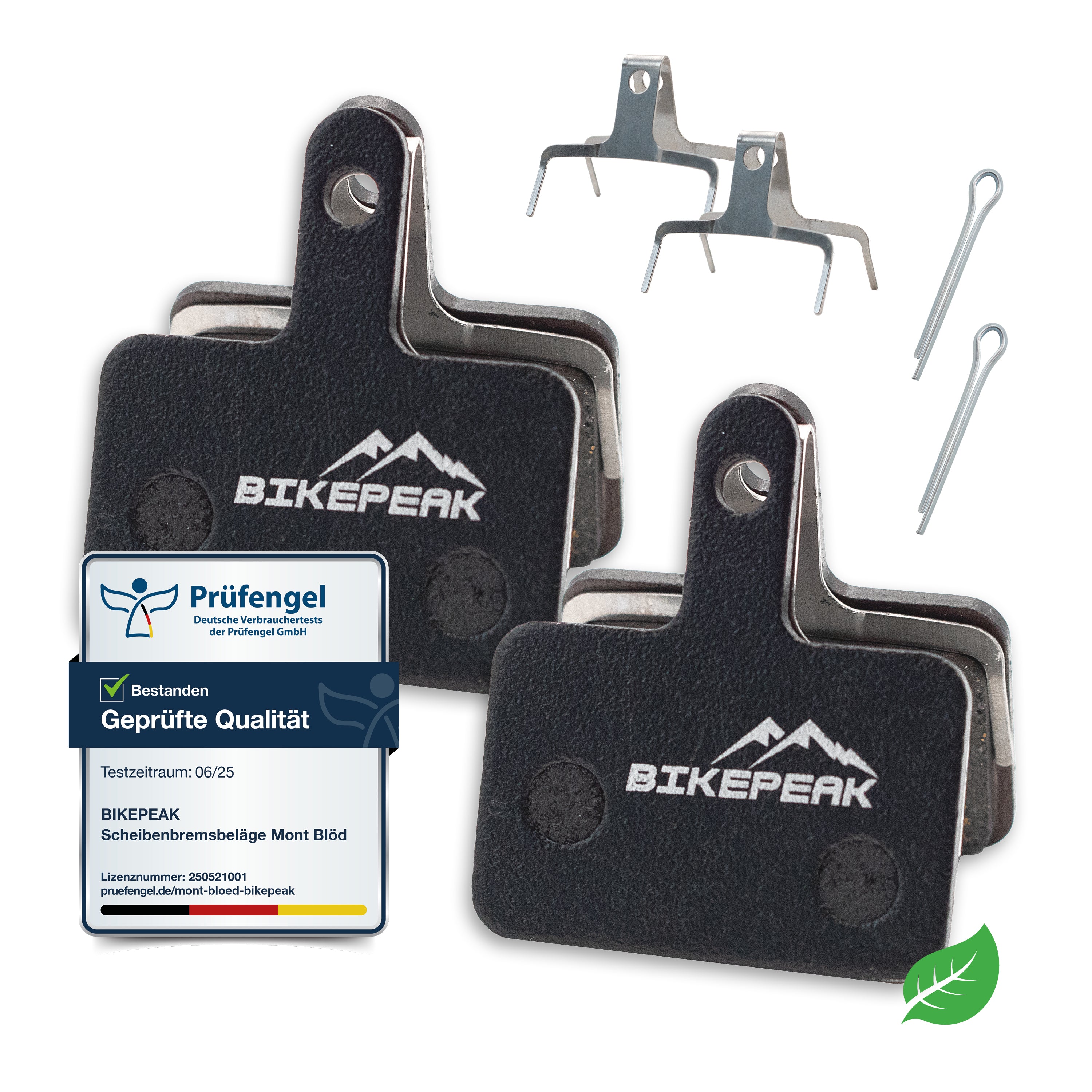 Wir präsentieren das BikePeak 2er-Set Scheibenbremsbeläge Mont Blöd! Diese organischen Bremsbeläge bieten eine leise und leistungsstarke Alternative zu Metallbelägen.