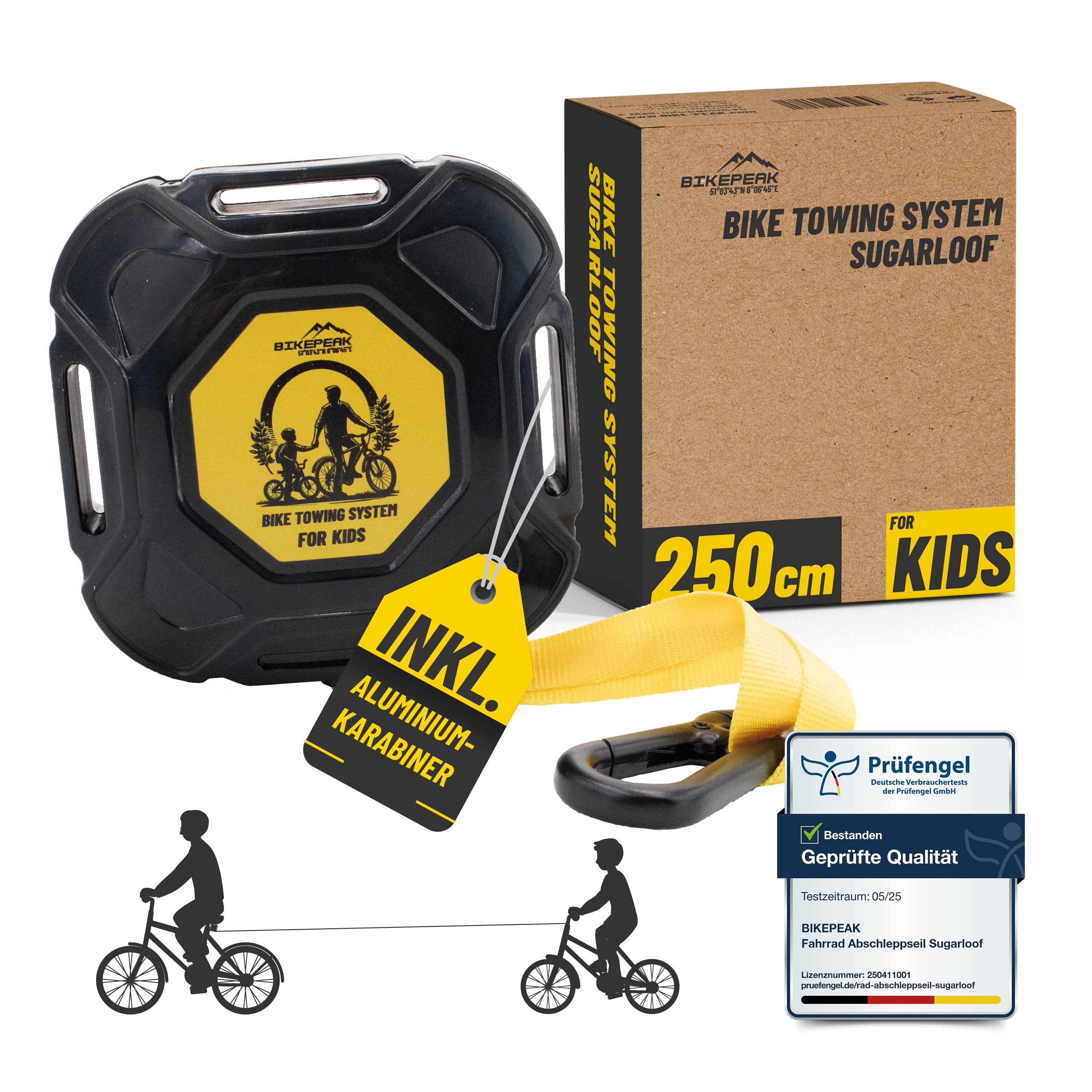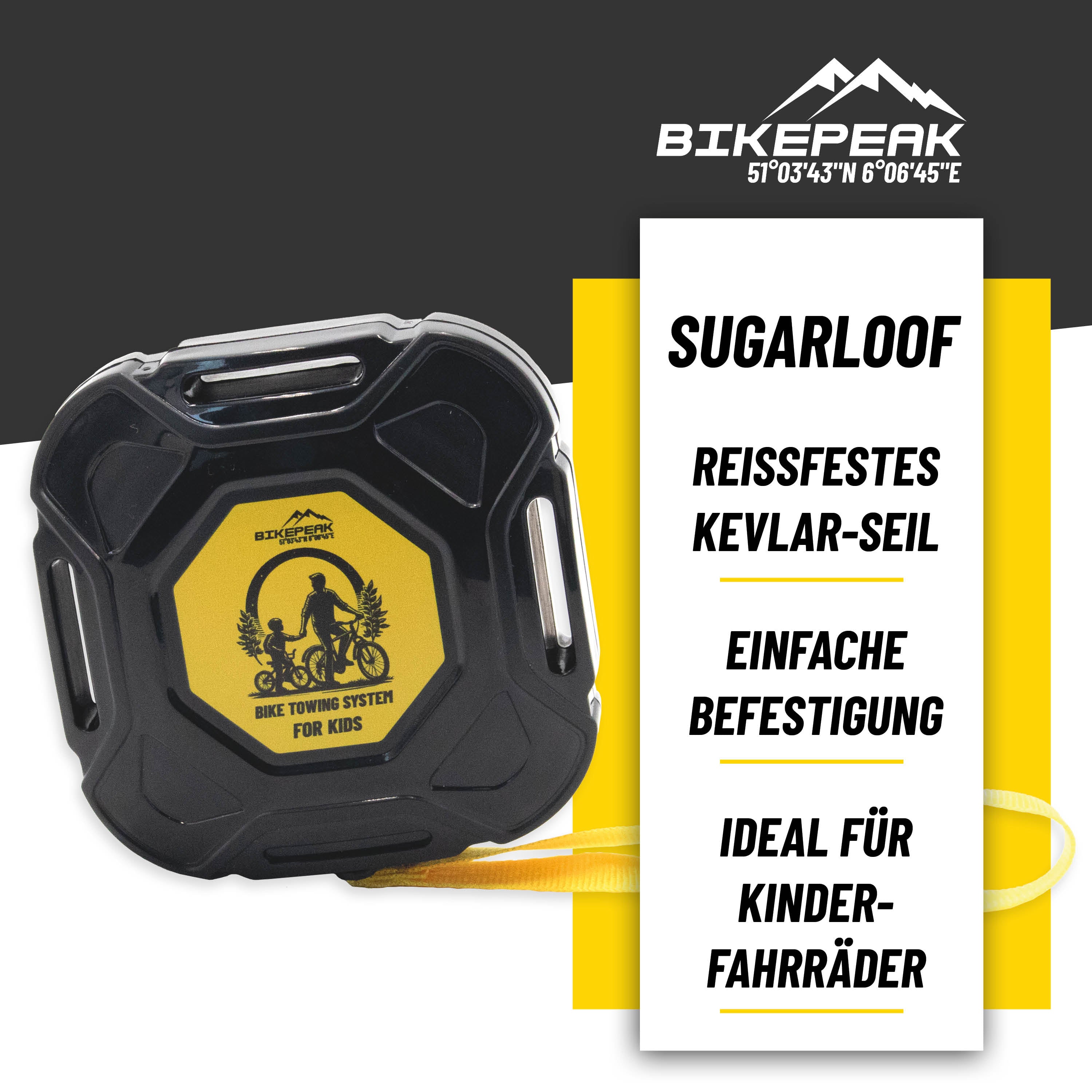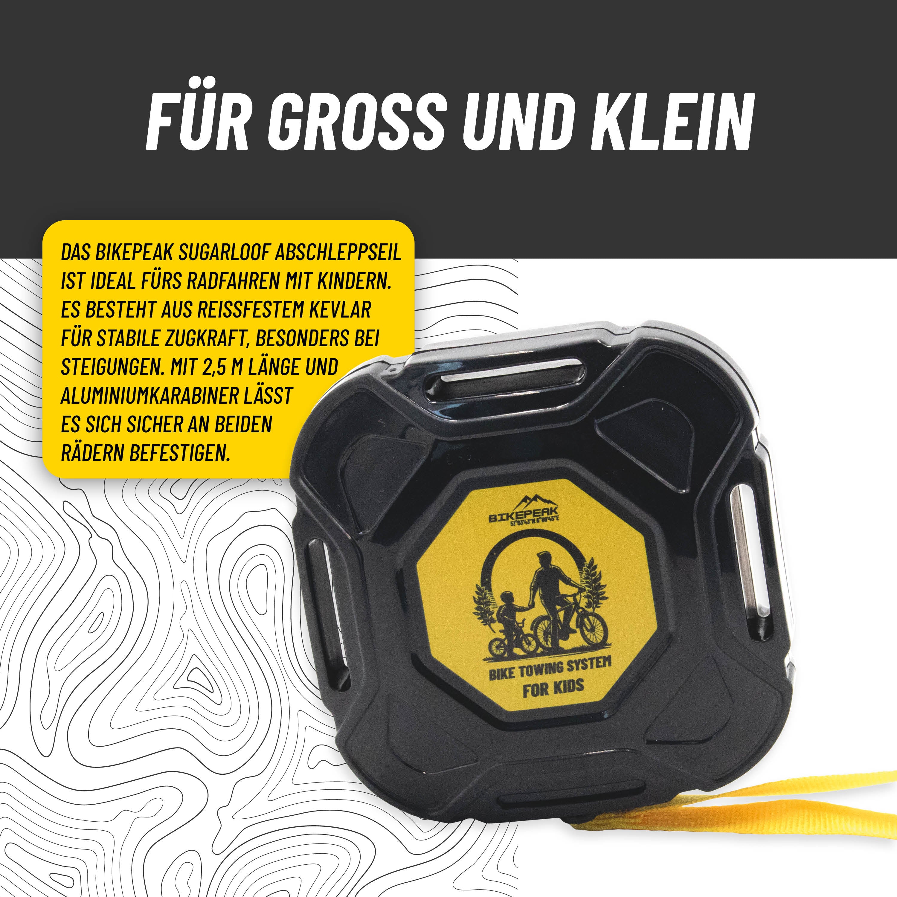 Zuverlässige Abschlepphilfe für Groß & Klein – Das Bikepeak Abschleppseil ermöglicht das sichere Ziehen von Erwachsenen, Kindern oder E-Bikes – ideal für Familienausflüge, steile Trails oder erschöpfte Mitfahrer.