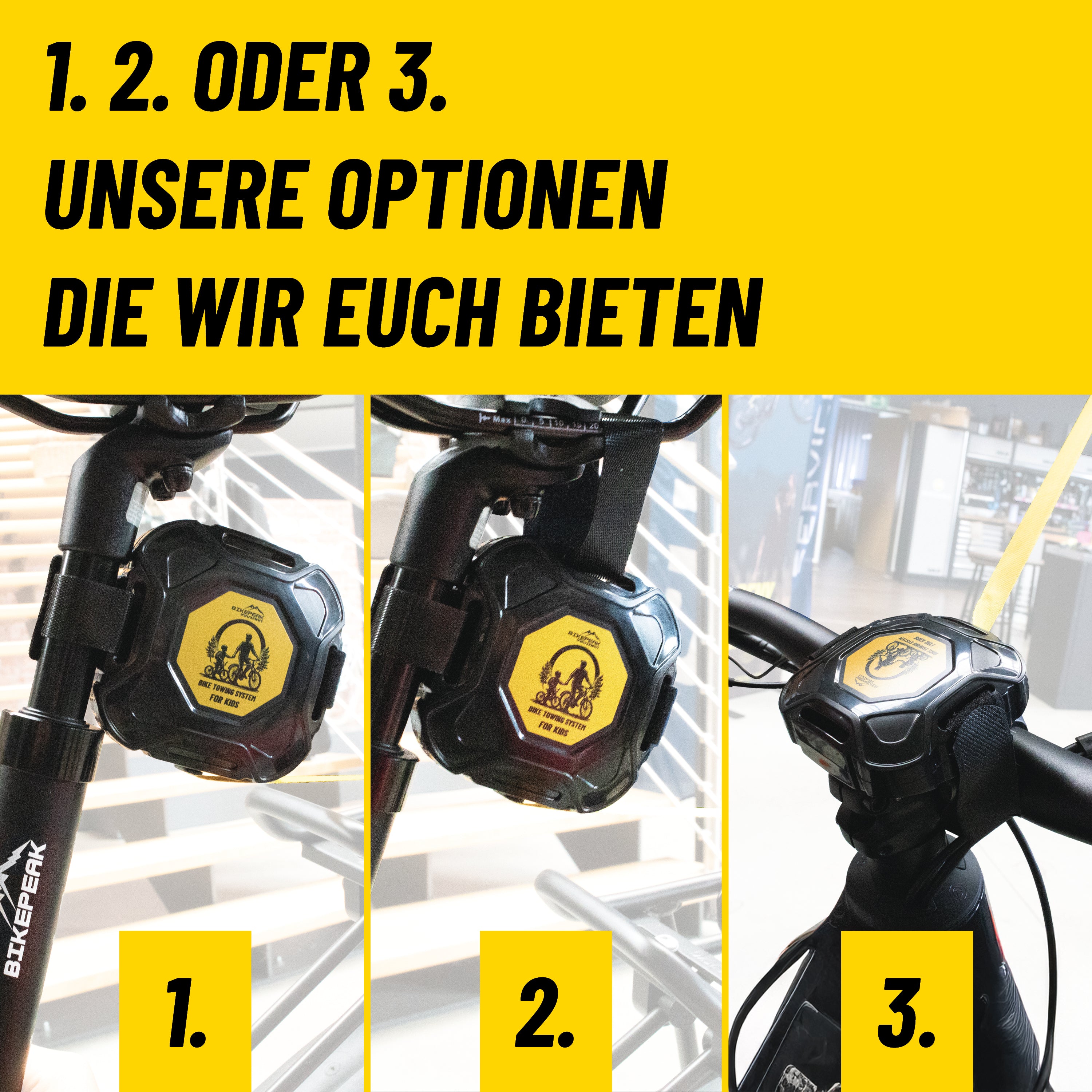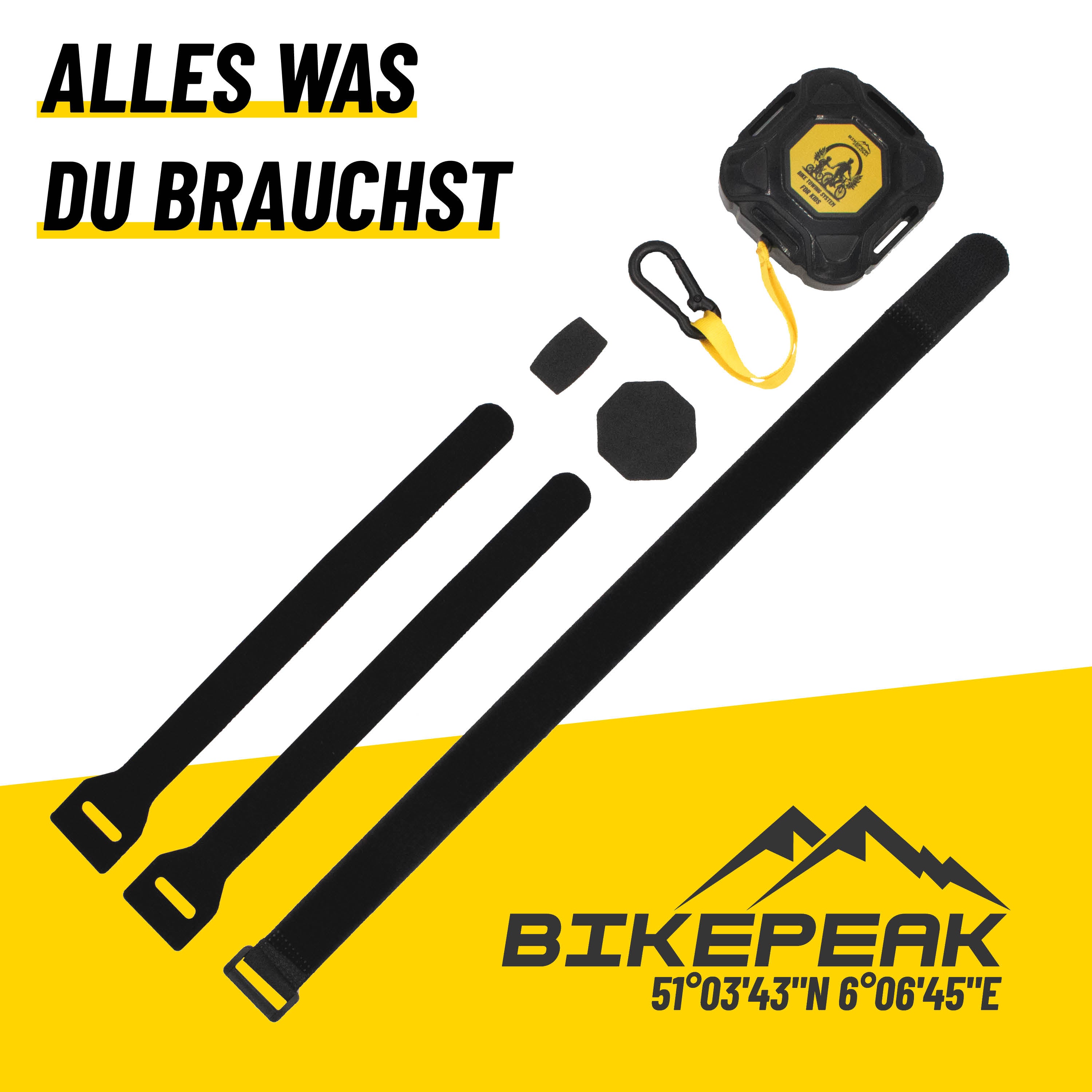 Einfach & flexibel montierbar – Schnell und werkzeuglos befestigt: Dank cleverem Klettsystem, Karabiner und Schlaufen ist Bikepeak mit nahezu jedem Fahrradtyp kompatibel – vom MTB bis zum E-Bike.