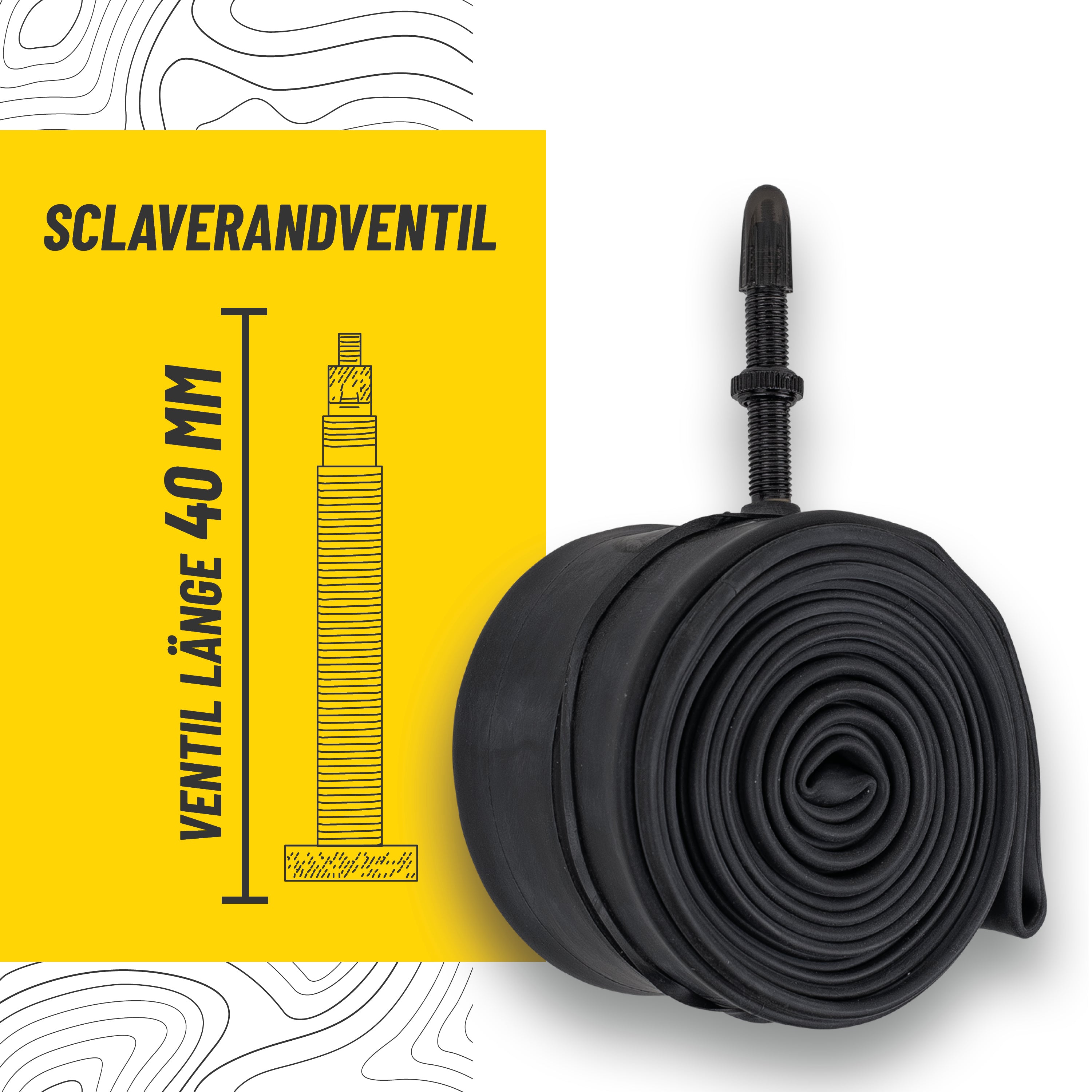 Das hochwertige Sclaverandventil (Presta-Ventil) unseres Schlauches sorgt für optimale Luftdichtigkeit und eine mühelose Aufpumpfunktion. Er kann mit sämtlichen Standardpumpen, Minipumpen, Handpumpen oder CO2-Kartuschenpumpen aufgepumpt werden.