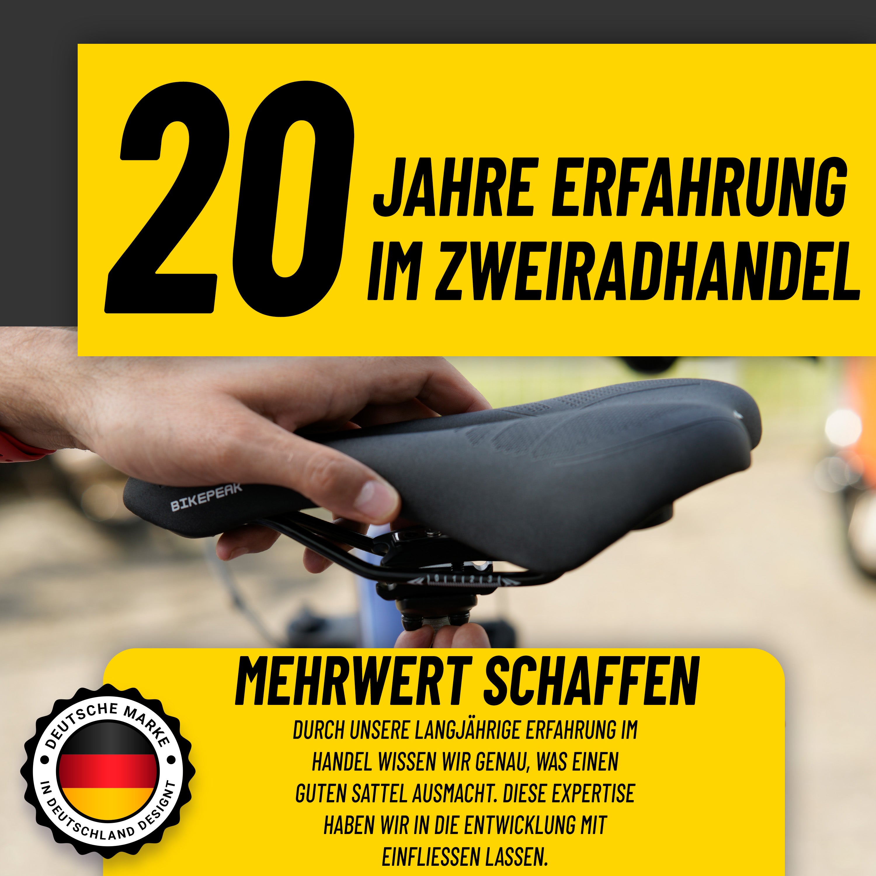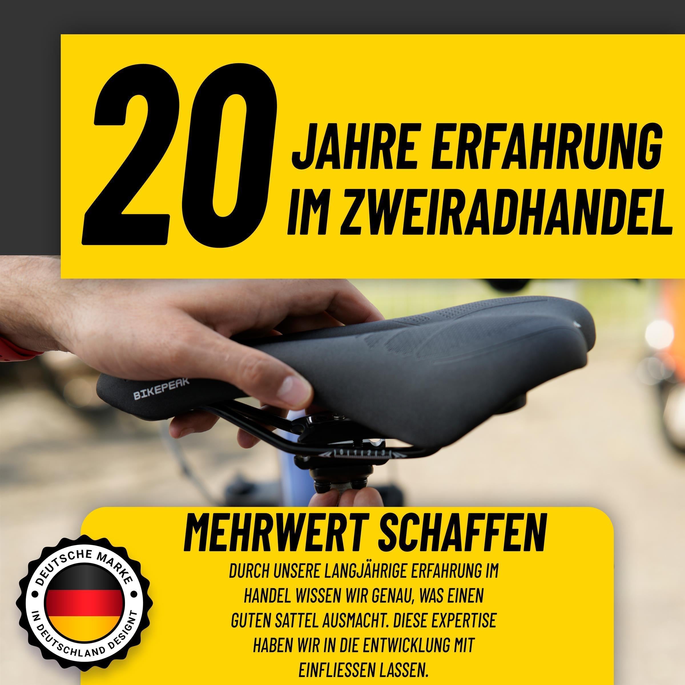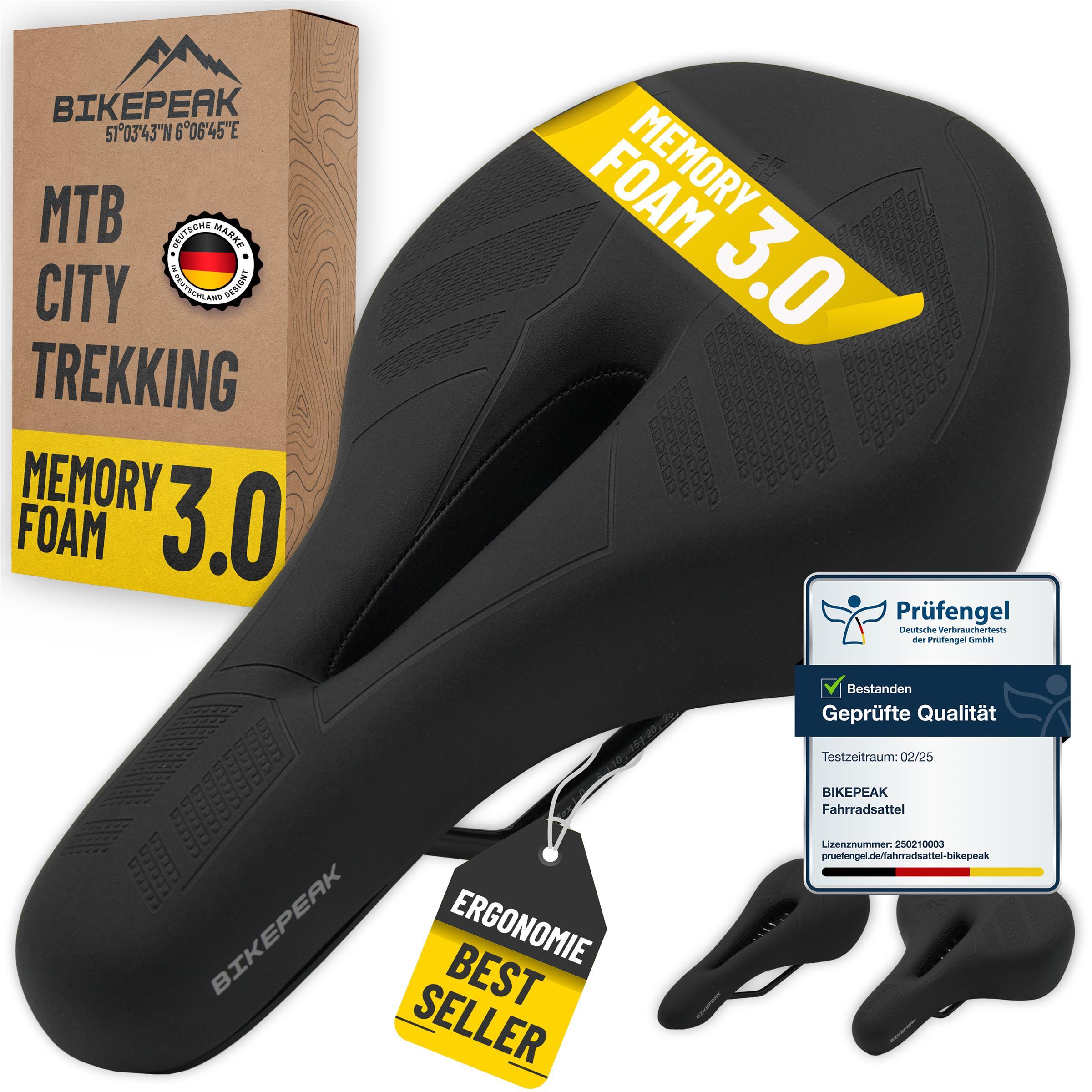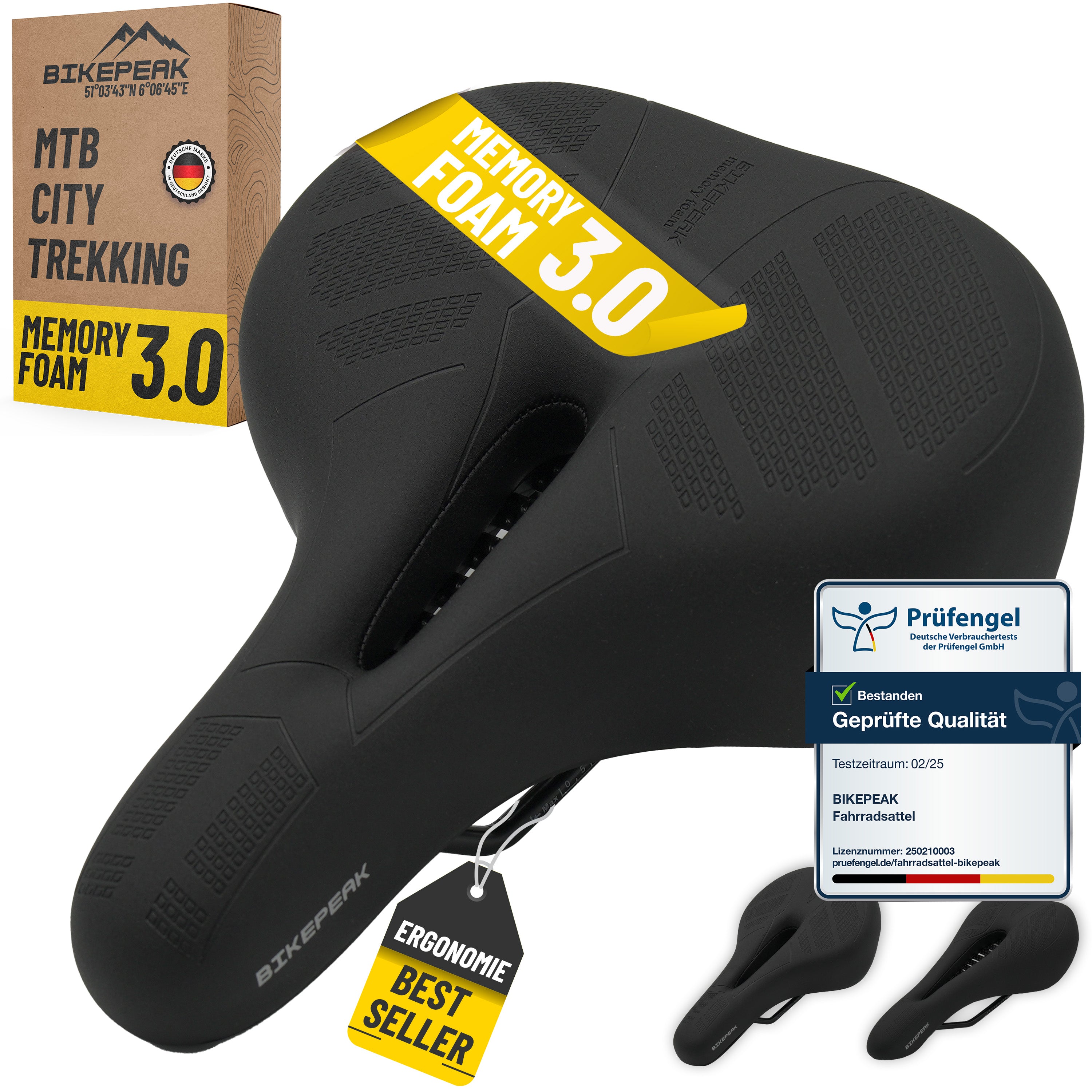 Der BikePeak Trekking Fahrradsattel wurde speziell für lange Fahrten und Trekkingtouren entwickelt und bietet hohen Komfort für Herren und Damen. Ausgestattet mit atmungsaktivem Memory-Schaum passt sich der Sattel optimal an die Körperform an und sorgt für eine druckfreie, angenehme Sitzposition. Seine ergonomische Form unterstützt die natürliche Sitzhaltung, reduziert Belastungen und beugt Ermüdung vor – ideal für ausgedehnte Touren.