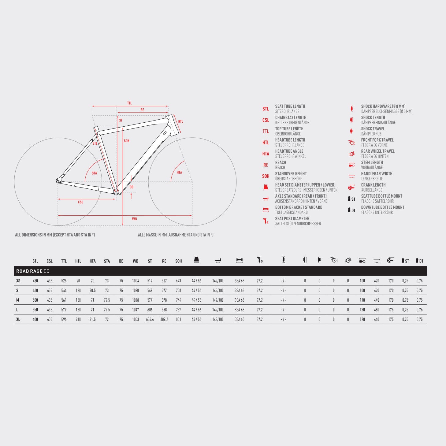 Zusätzlich verfügt das Road Rage EQ AL über praktische Extras wie einen Tubus Vega Evo Gepäckträger, SKS Edge 46 AL Schutzbleche und eine Beleuchtung von Lezyne. Die Rück- und Vorderlichter Hecto Pro 65 machen das Fahren bei Dunkelheit sicherer und sorgen für eine gute Sichtbarkeit im Straßenverkehr. Die Felgen von WTB STp i23, die Reifen von WTB Riddler 700x37c und die Speichen von DT Swiss 2.0 runden das Gesamtpaket ab und machen das Fahrrad zu einem zuverlässigen Begleiter für lange Strecken und Alltagseinsätze.
