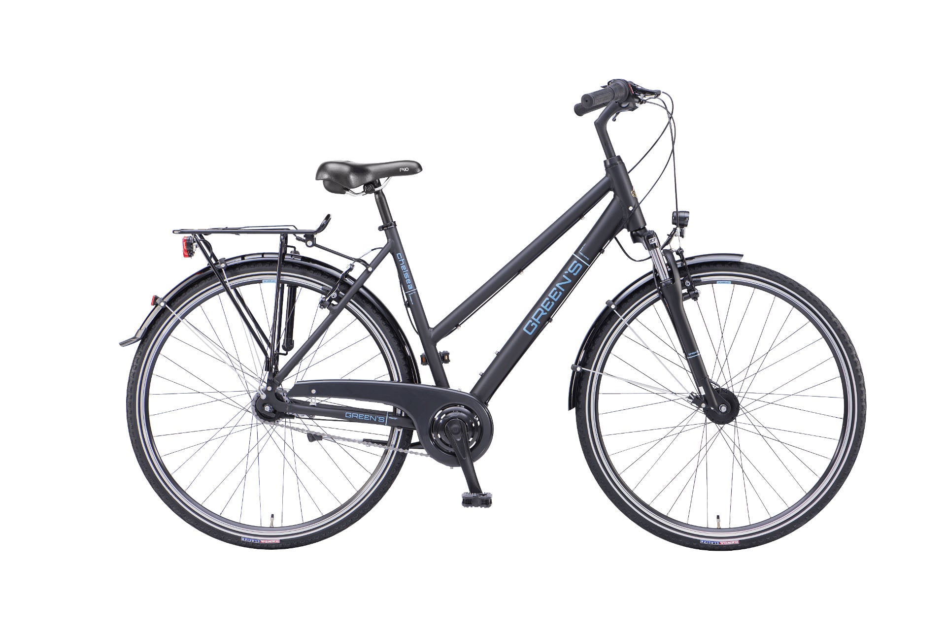 Das Green's Chelsea ist mit einem zuverlässigen Nabendynamo und einem AXA Ecoline Scheinwerfer mit 15 Lux ausgestattet, der für ausreichende Sichtbarkeit bei Dunkelheit sorgt. Das AXA Standrücklicht gewährleistet zusätzliche Sicherheit auf der Straße.
