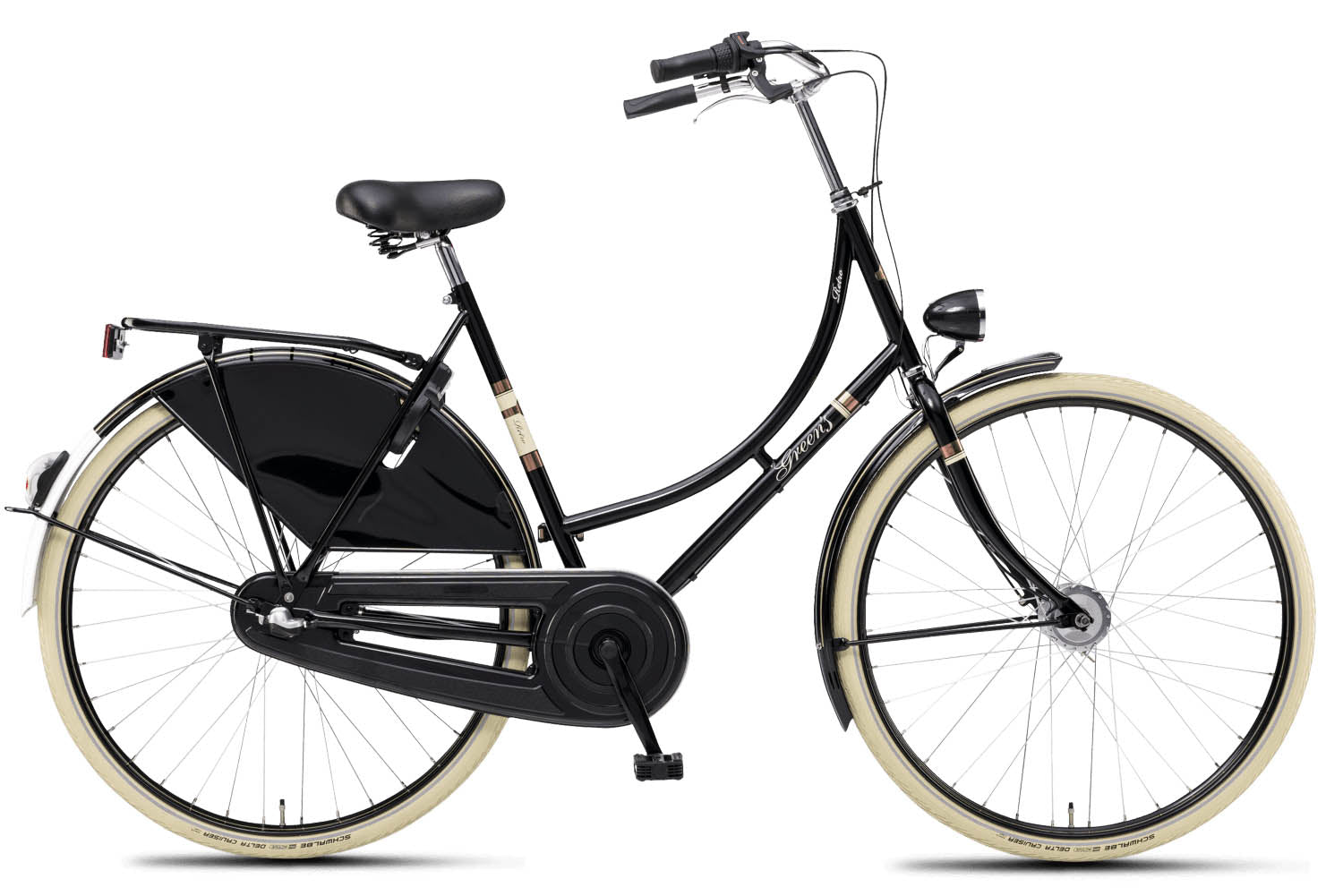 Der verchromte Sattelstütze und der feste Vorbau verleihen dem Fahrrad einen zusätzlichen Hauch von Retro-Stil. Die Deli Tire Creme Reflex Reifen in der Größe 40-635 mit Reflexstreifen bieten nicht nur eine gute Traktion, sondern passen auch perfekt zum Retro-Look des Fahrrads. Die Stahlgepäckträger hinten ermöglichen es, kleinere Gegenstände sicher zu transportieren.
