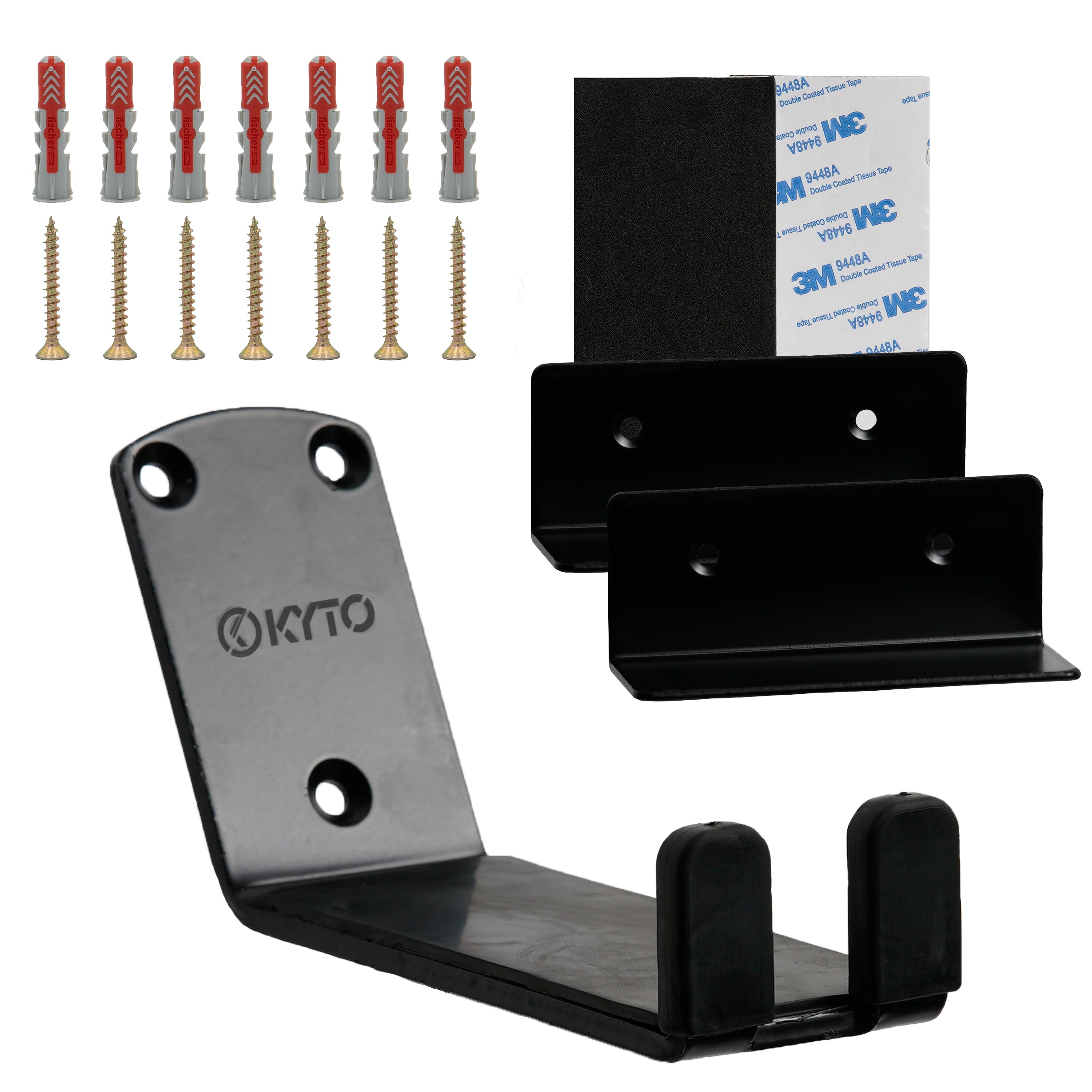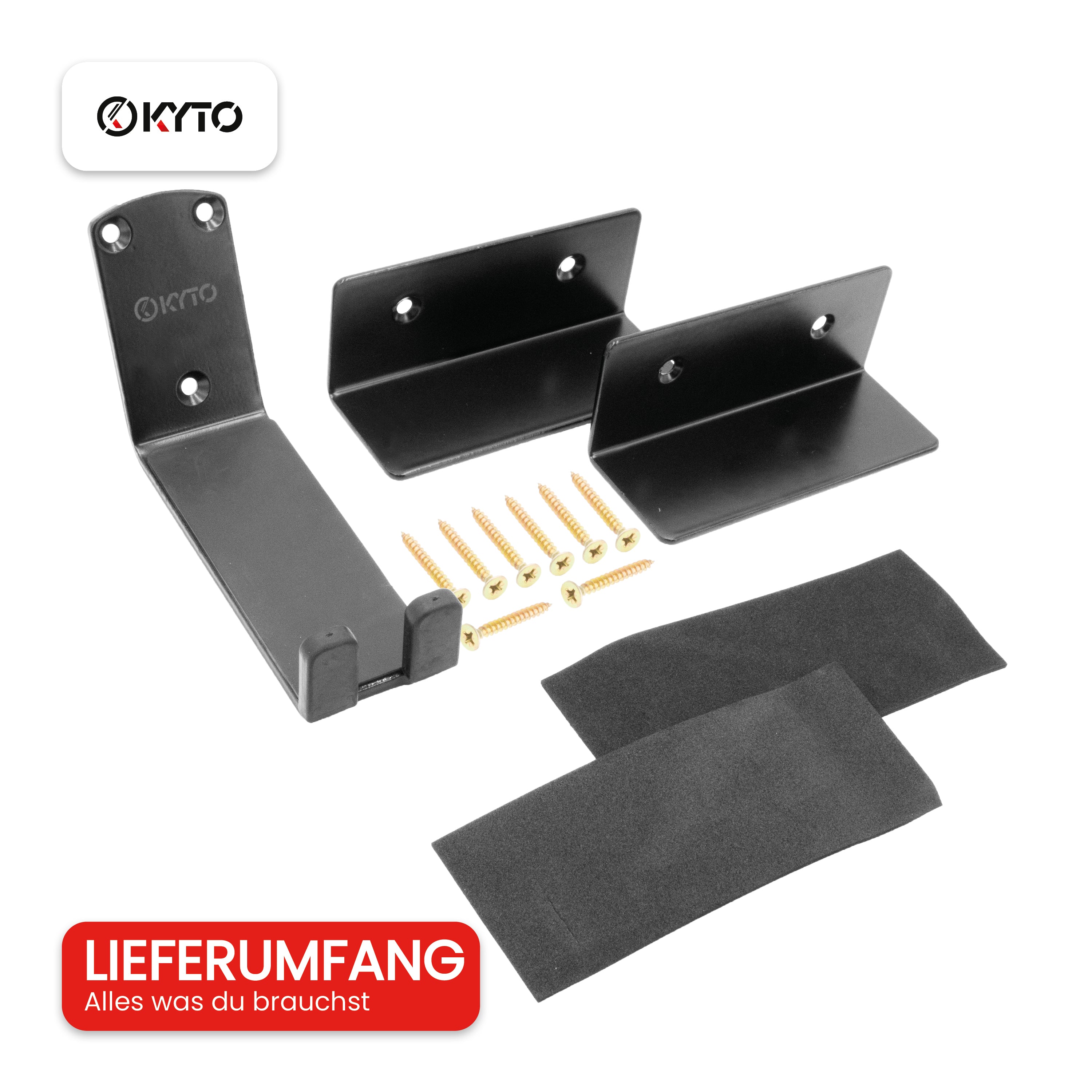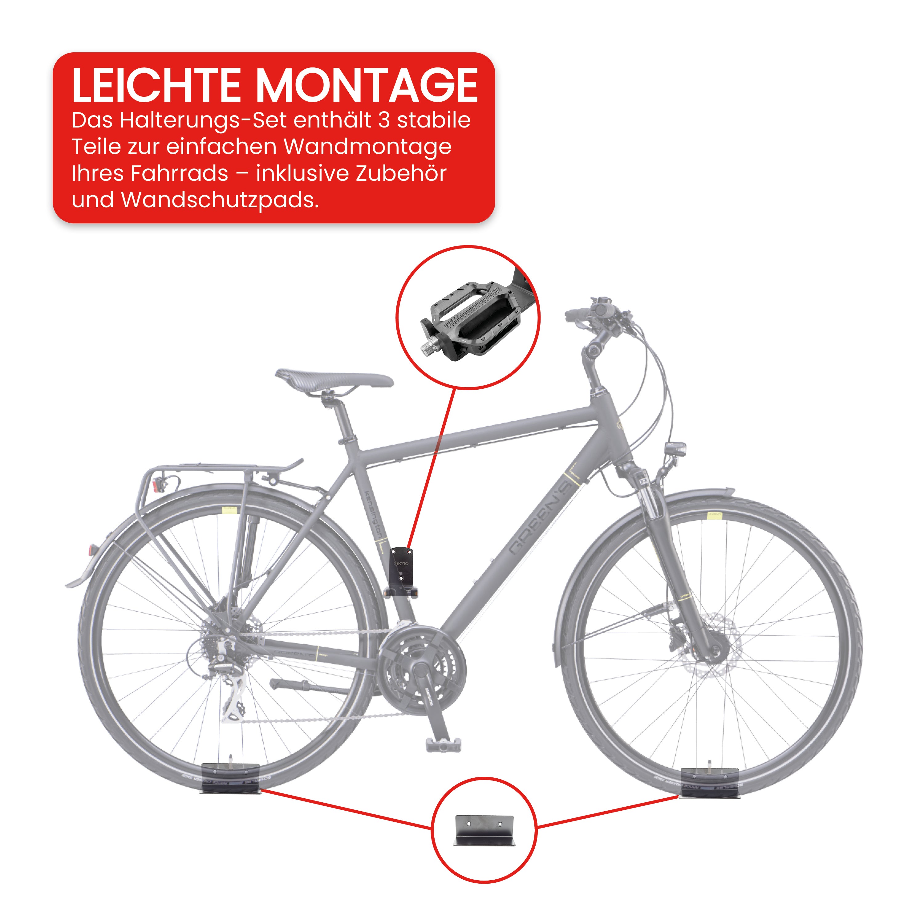 Die Installation ist kinderleicht! Unser Halterungsset enthält drei robuste Teile zur einfachen Wandbefestigung Ihres Fahrrads mit passenden Schrauben und Wandschutzpads.