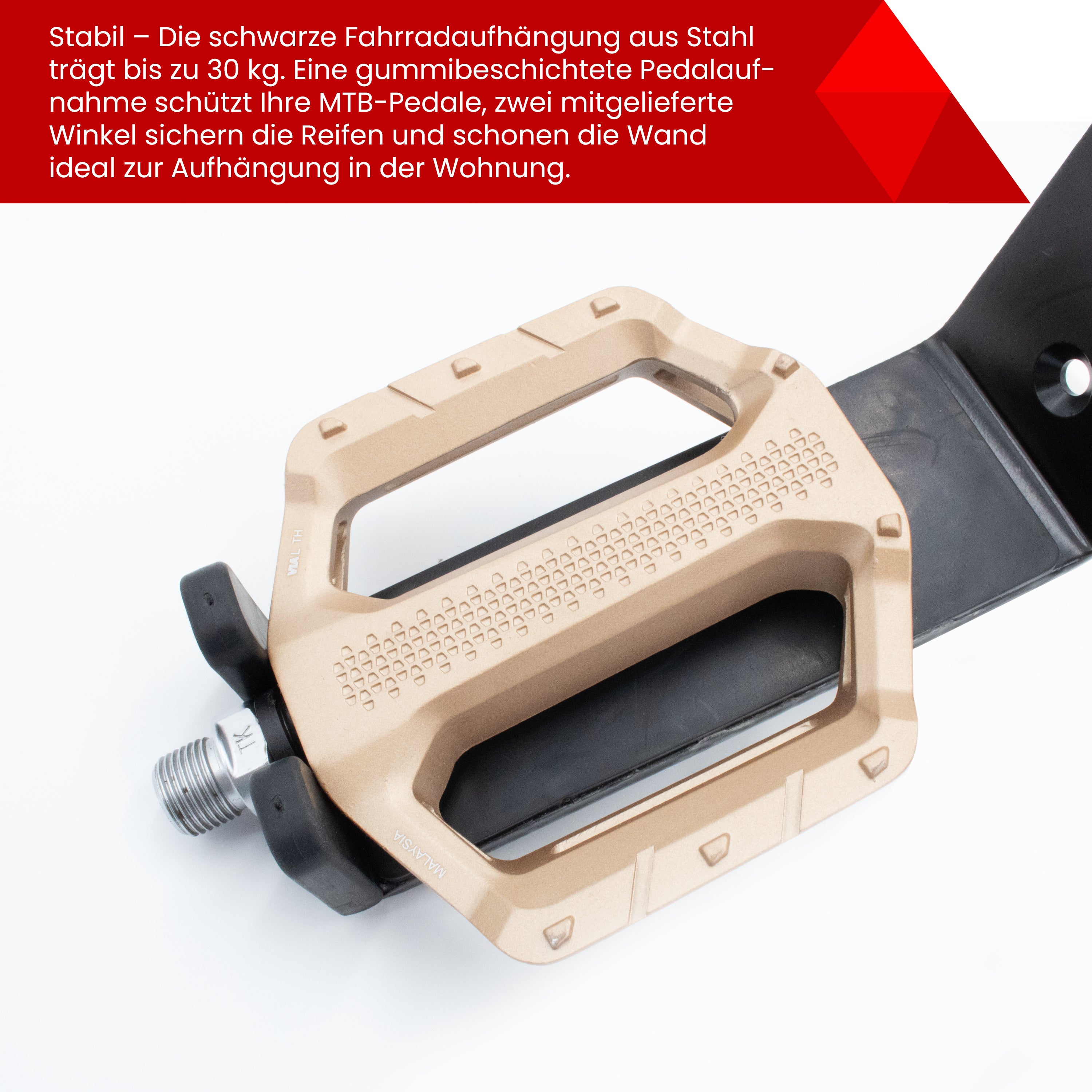 Stabilität ist oberstes Gebot! Unsere Fahrrad-Aufhängung besteht aus robustem Stahl und ist in elegantem Schwarz gehalten. Die Pedalaufnahme verfügt über eine schützende Gummibeschichtung, die Ihre MTB-Pedale vor Beschädigungen bewahrt. Die mitgelieferten Winkelteile bieten nicht nur sicheren Halt für Ihre Reifen, sondern halten auch Ihre Wand sauber.
