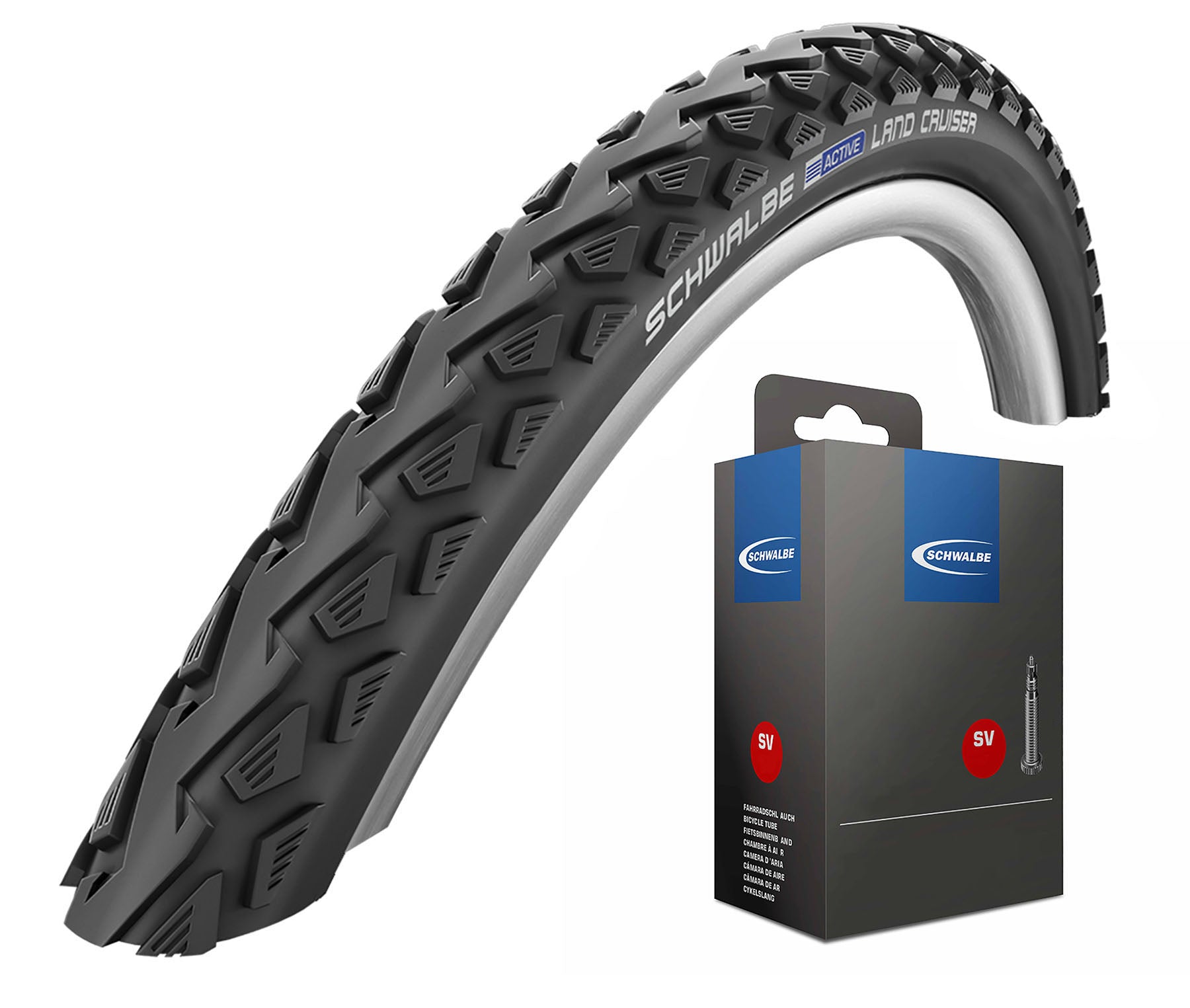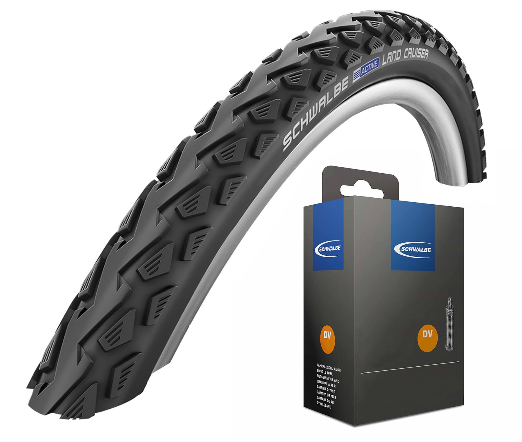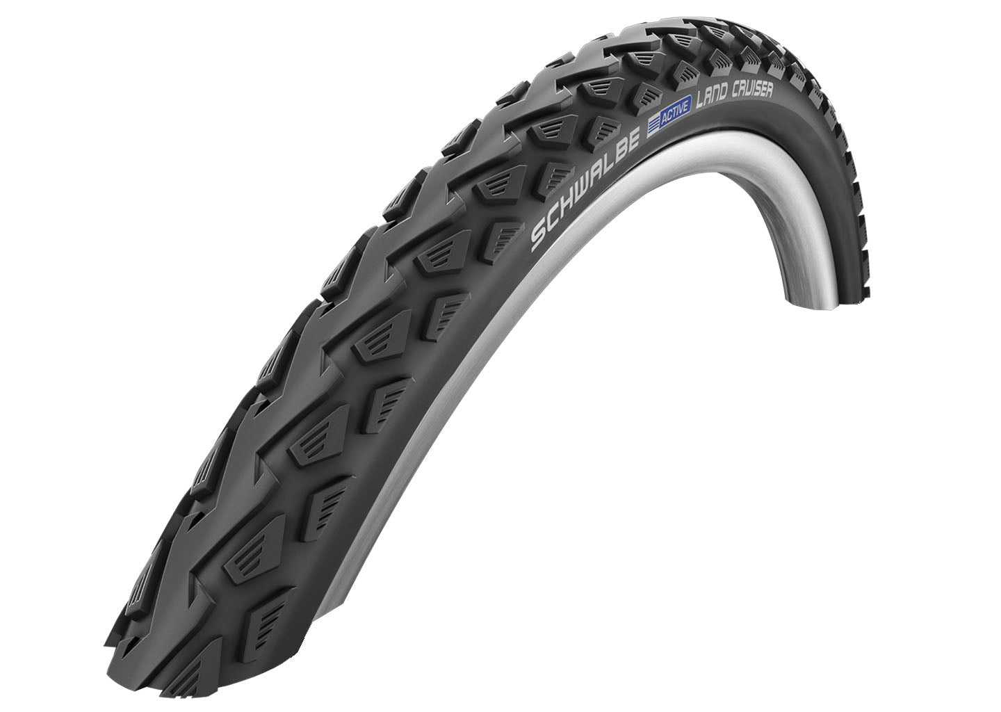 Der Schwalbe Land Cruiser Fahrradreifen kann auf jedem Untergrund gefahren werden. Der Reifen verfügt über einen K-Guard Pannenschutz.