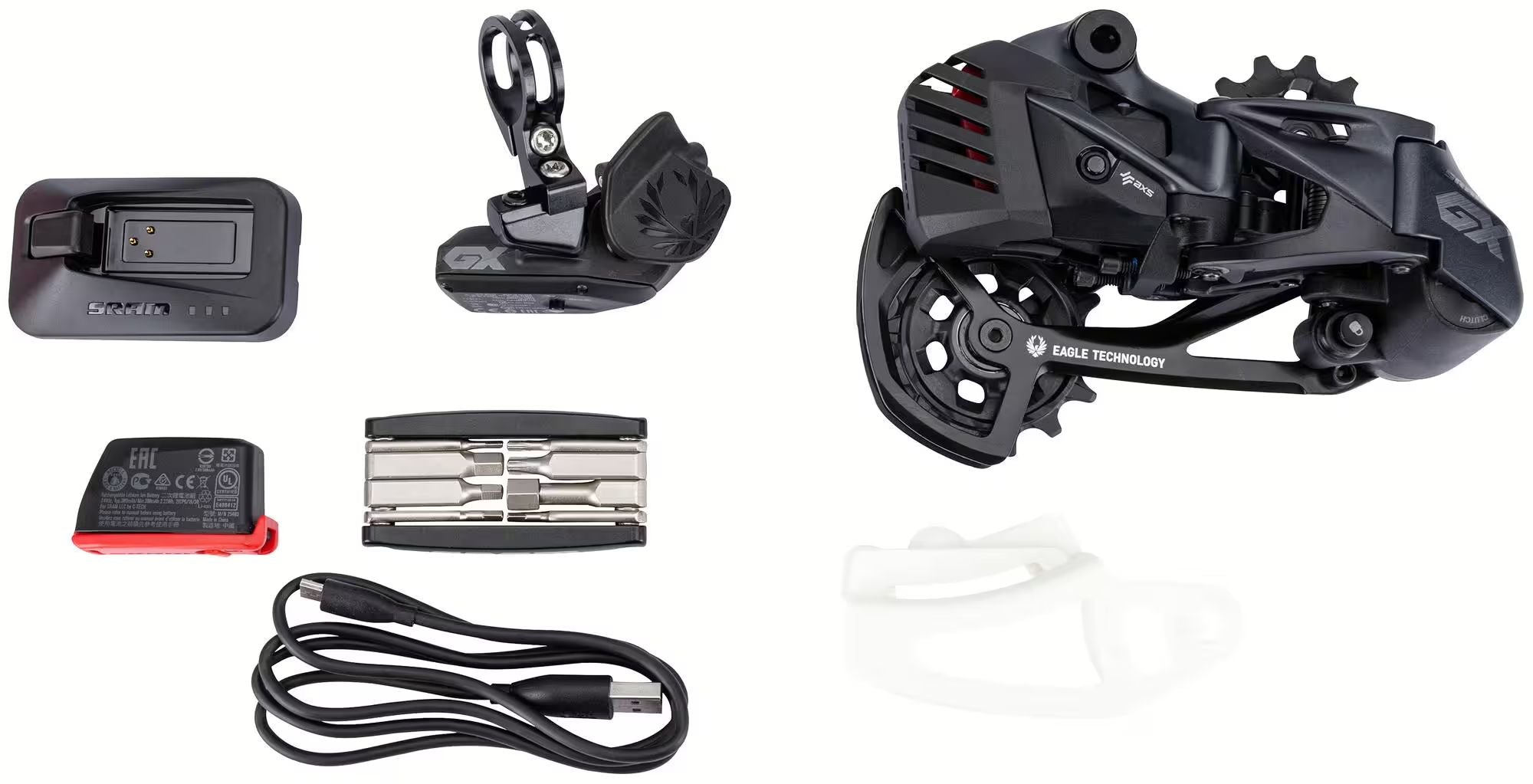 Das SRAM GX Eagle AXS Upgrade-Kit ermöglicht den einfachen Umstieg auf kabelloses, elektronisches Schalten. Das Set enthält das GX Eagle AXS Schaltwerk, den passenden Schalter, Akku mit Schutz, Ladegerät samt Kabel sowie Einstell- und Multifunktionswerkzeug. Die AXS Technologie sorgt für präzise, schnelle Schaltvorgänge und eine saubere Optik ohne Schaltzüge. Ideal für leistungsorientierte Mountainbiker, die Wert auf moderne Technik und zuverlässige Performance legen.