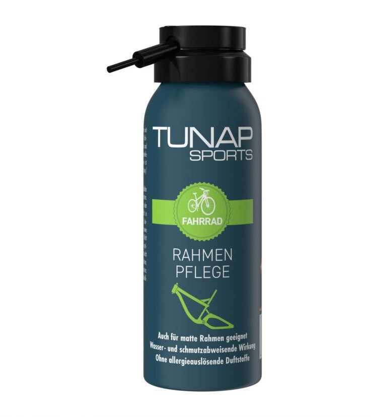 Die TUNAP SPORTS Rahmenpflege versiegelt die Oberfläche des Rahmens und schützt vor Korrosion und Schmutz. Die Pflege ist für alle Oberflächenstrukturen geeignet und besonders materialverträglich auch bei mattlackierten Rahmen. Durch die Spray-On Anwendung ist die Handhabung besonders einfach.