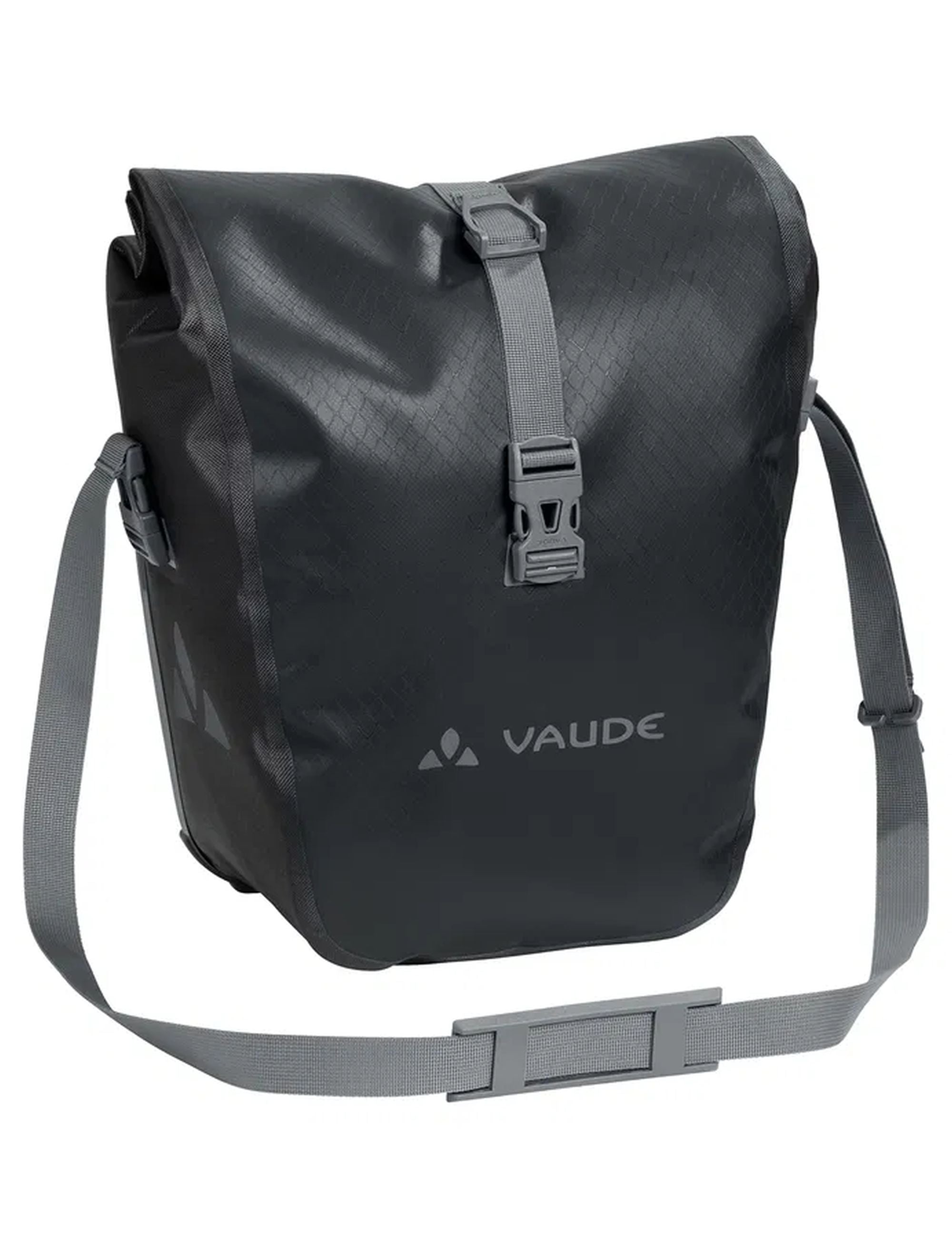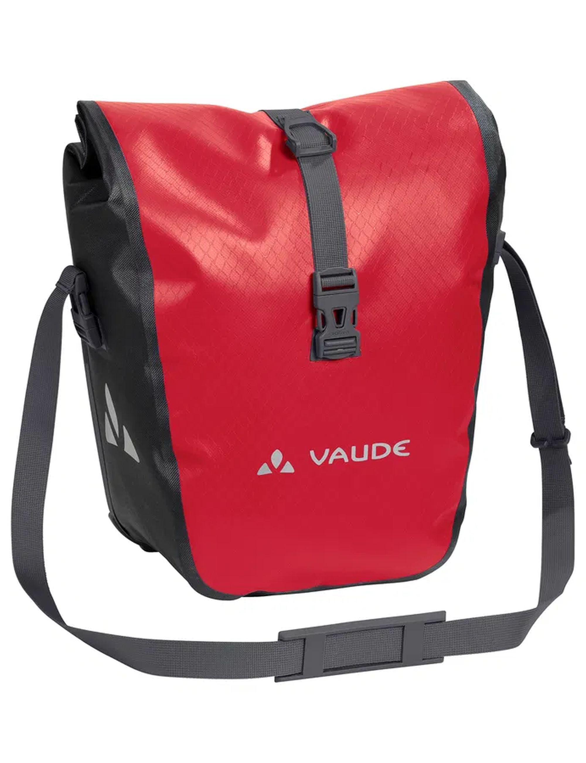 Die Vaude Aqua Front Doppeltasche ist die perfekte Begleiterin für umweltbewusste Radreisende. Hergestellt in Deutschland, klimaneutral und aus PVC-freiem Planenmaterial, überzeugt sie mit einem wasserdicht verschweißten, geräumigen Hauptfach. Der praktische Wickelverschluss lässt sich oben oder unten schließen. Mit Schulter- und Bauchgurt, abnehmbarem Tragegurt sowie dem leicht einstellbaren, abschließbaren QMR 2.0-System ist sie vielseitig und sicher montierbar. Reflexlogo und -streifen sorgen für Sichtbarkeit.