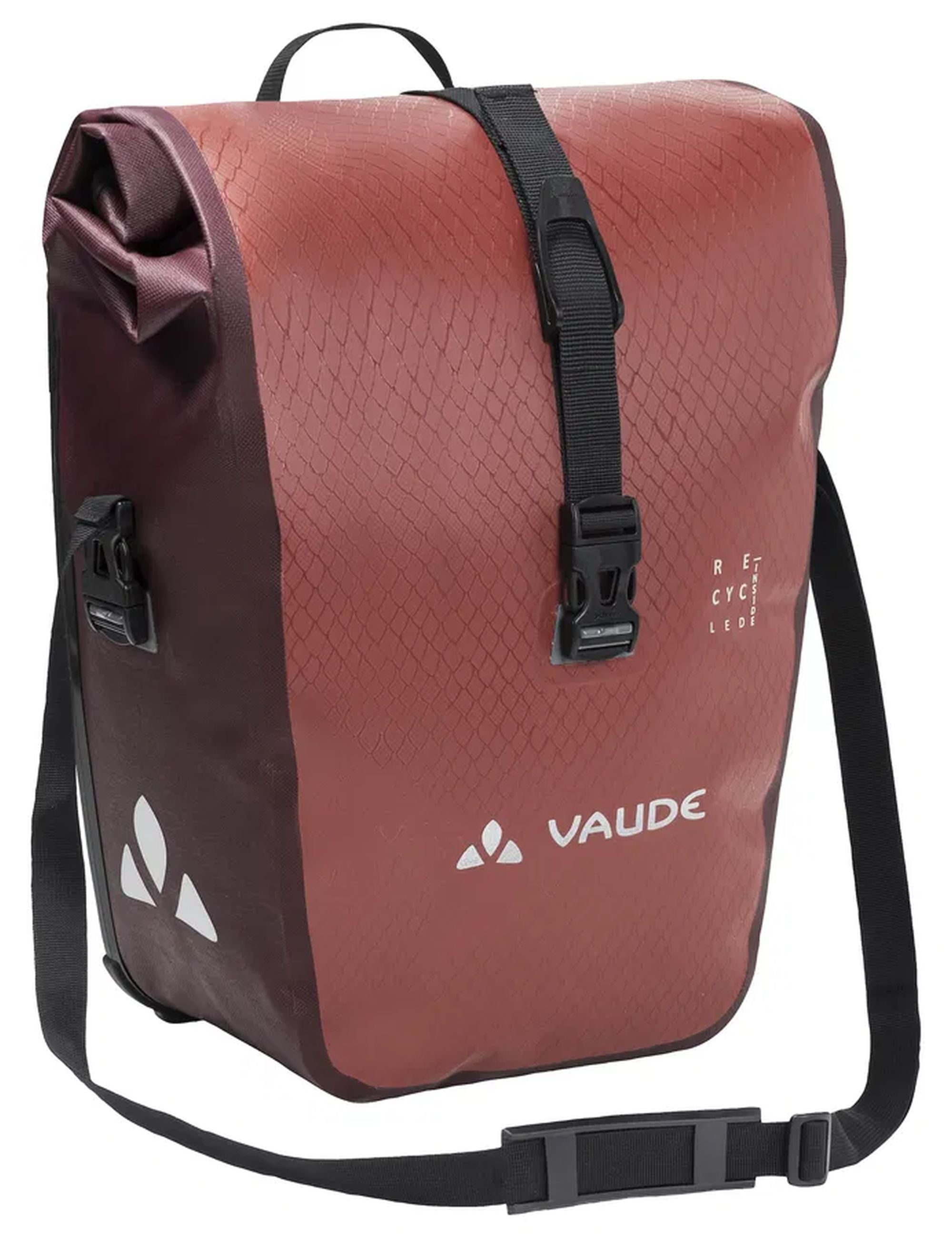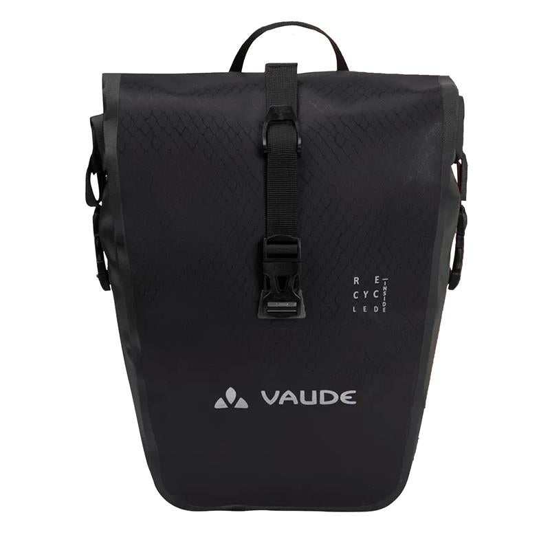Die Vaude Aqua Front Recycle ist die wasserdichte Vorderradtasche für umweltbewusste Radreisende. Hergestellt in Deutschland aus recyceltem, PVC-freiem Planenmaterial, bietet sie mit 28 l Volumen und Innentasche viel Stauraum. Der Wickelverschluss schützt zuverlässig vor Nässe. Dank QMR 2.0-System lässt sich die Tasche einfach und sicher an Lowrider-Gepäckträgern (8–16 mm) befestigen. Mit abnehmbarem Schultergurt (auch als Spanngurt nutzbar) und Reflexlogo für bessere Sichtbarkeit. Schloss separat erhältlich.